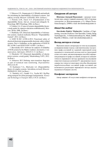 9. Зеленцов Б.П. Формирование диаграмм состояний-переходов в условиях мониторинга технического состояния. Надежность. 2022. № 2. С. 22-29.