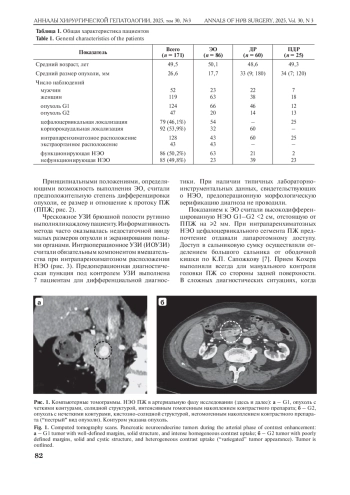 Материал и методы. С 2014 по 2025 г. выполнено 386 резекций поджелудочной железы, из них 82 (21,24%) по поводу кистозных опухолей. Средний возраст пациентов составил 51 ± 10,7 года, 63,4% больных – женщины.