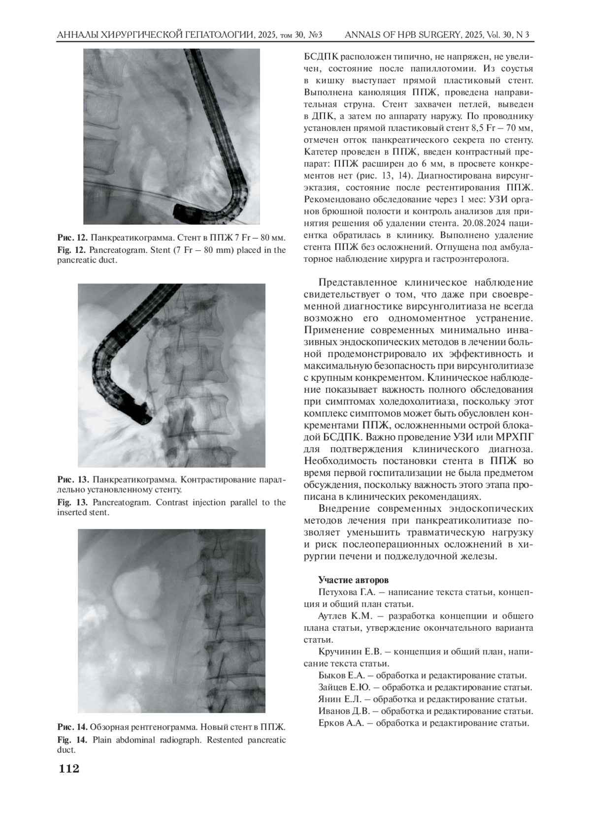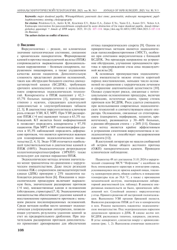 Заключение. Эндоскопические методы (литотрипсия, стентирование) – стандарт лечения при вирсунголитиазе благодаря минимальной инвазивности, эффективности и малому риску рецидива. Однако осложнения стентирования требуют строгого контроля. Клиническое наблюдение подтверждает необходимость поэтапного подхода и разработки стандартизованных протоколов для оптимизации результатов лечения.
