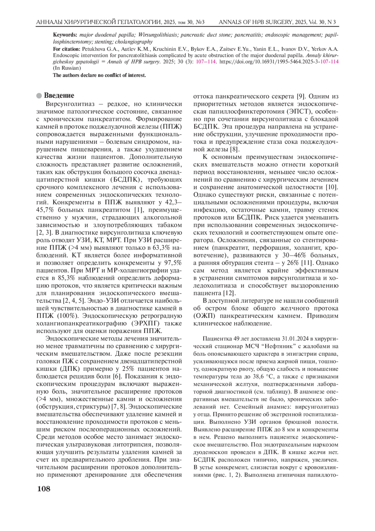 Вирсунголитиаз – редкое, но клинически значимое патологическое состояние, связанное с хроническим панкреатитом. Формирование камней в протоке поджелудочной железы (ППЖ) сопровождается выраженными функциональными нарушениями – болевым синдромом, нарушением пищеварения, а также ухудшением качества жизни пациентов.