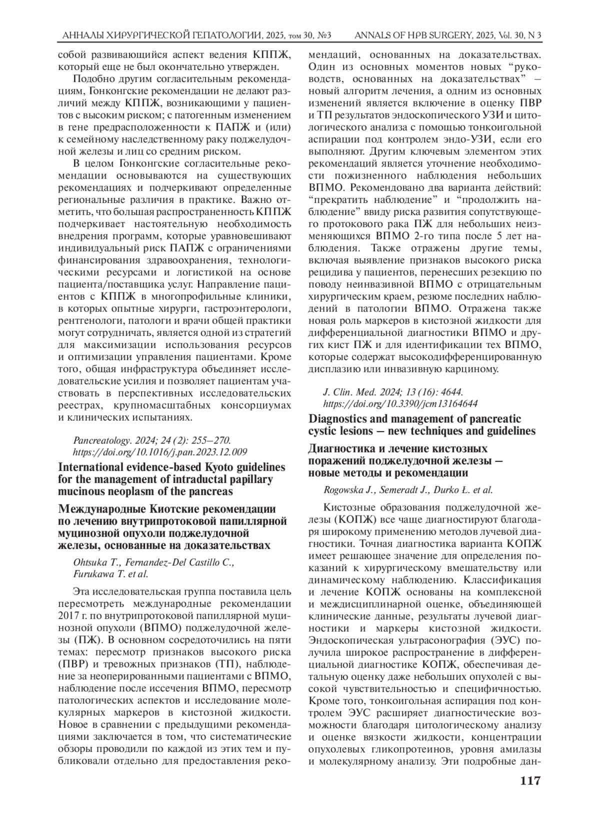 Внутрипротоковые папиллярные муцинозные неоплазии представляют собой кистозные новообразования поджелудочной железы с риском малигнизации. Обзор затрагивает современные рекомендации по лечению пациентов с этим заболеванием, показания к хирургическому вмешательству, результаты оперативного лечения и стратегии наблюдения за пациентами. В нем также освещены последние достижения в мини-инвазивной хирургии и новые биомаркеры, направленные на совершенствование распределения рисков по уровням и сокращение числа неоправданных оперативных вмешательств.