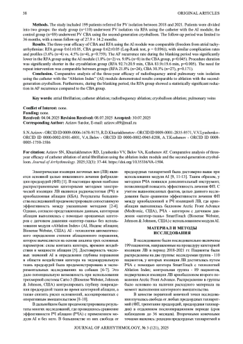 Заключение. Сравнительный анализ трехлетней эффективности радиочастотной антральной изоляции легочных вен катетером с использованием модуля AI продемонстрировал сопоставимость результатов с аблацией криобаллоном второго поколения. При этом в «слепом» периоде наблюдения группа РЧА характеризовалась статистически значимым снижением частоты рецидивов предсердной тахиаритмии по сравнению с группой КБА.