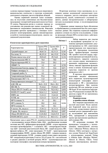 Материал и методы исследования. В исследование были включены 199 пациентов, направленных на процедуру катетерной изоляции ЛВ в период 2018-2021 гг. Пациенты были распределены на две группы: исследуемая группа - 110 пациентов, у которых изоляция ЛВ достигалась путем РЧА с помощью катетера с модулем AI; контрольная группа - 89 пациентов, подвергшиеся КБА ЛВ криобаллоном второго поколения. Период наблюдения был ограничен 36 месяцами, средний период наблюдения составил 27,9±14,2 месяцев.