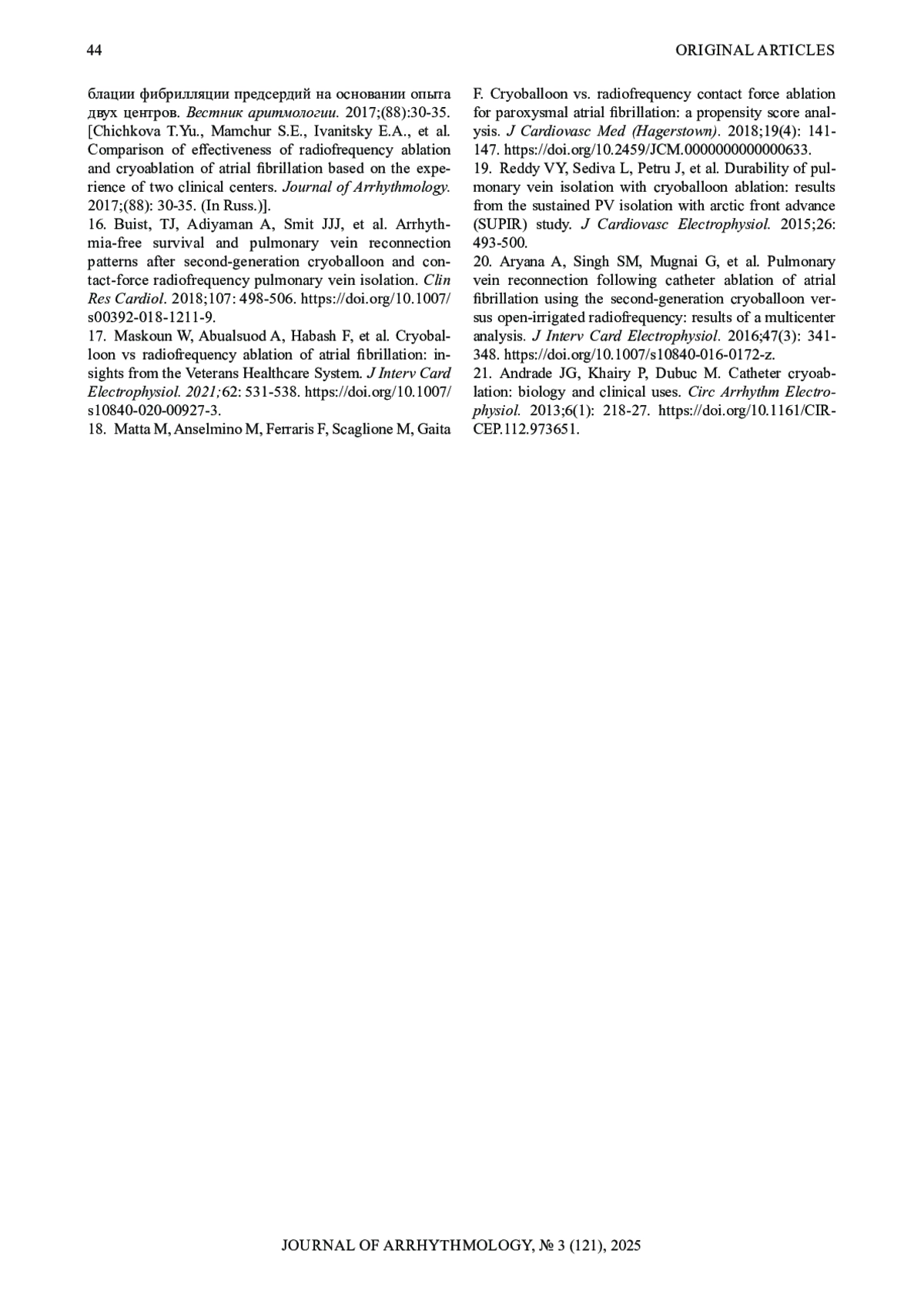 17. Артюхина ЕА, Сатинбаев ЗИ. Катетерная аблация с использованием технологии “индекс аблации”. Анналы аритмологии. 2022;19(1): 32-38.