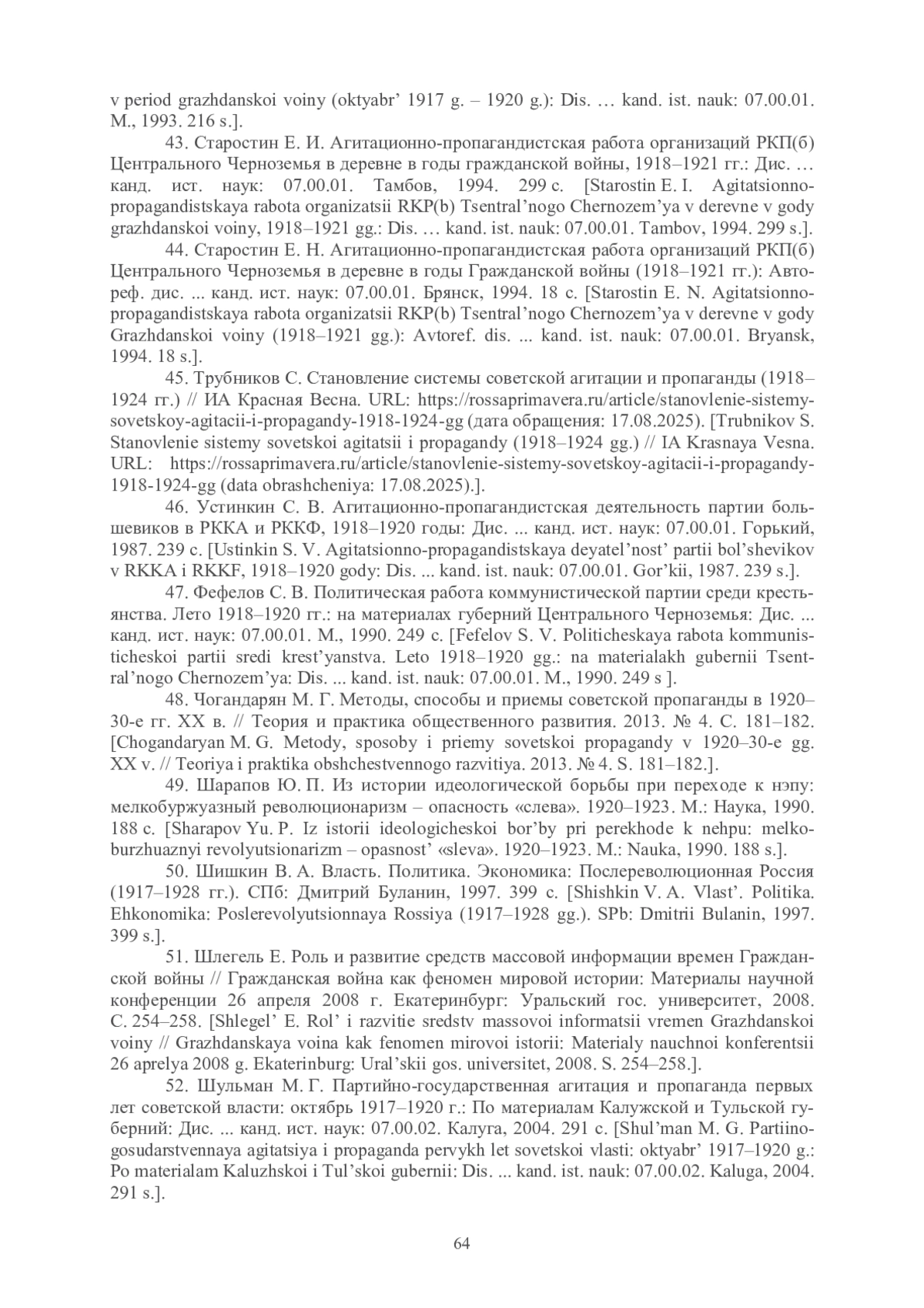 44. Старостин Е. Н. Агитационно-пропагандистская работа организаций РКП(б) Центрального Черноземья в деревне в годы Гражданской войны (1918-1921 гг.): Автореф. дис.. канд. ист. наук: 07.00.01. Брянск, 1994. 18 с. EDN: ZLNBNV