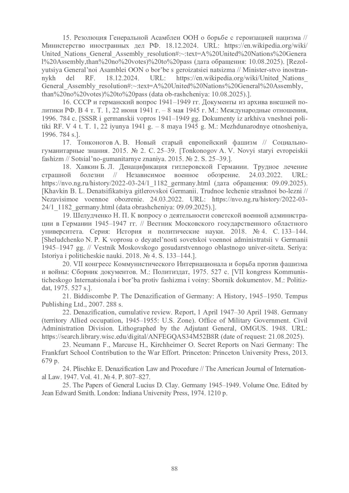 18. Хавкин Б. Л. Денацификация гитлеровской Германии. Трудное лечение страшной болезни // Независимое военное обозрение. 24.03.2022. URL: https://nvo.ng.ru/history/2022-03-24/1_1182_germany.html (дата обращения: 09.09.2025).