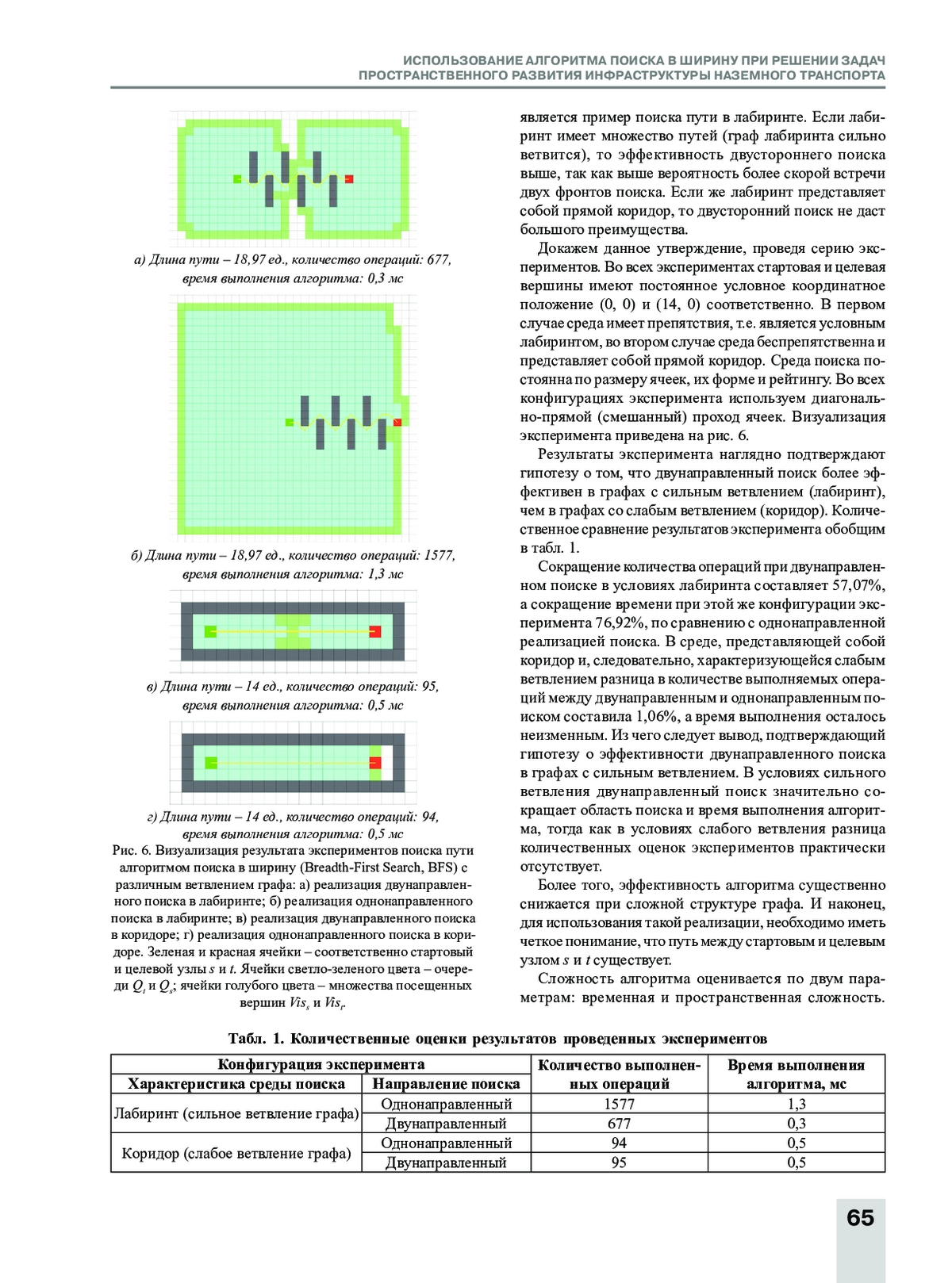 Цель. Рассмотреть вопрос применимости алгоритма поиска пути в ширину для решения задач пространственного развития линейных объектов наземной транспортной инфраструктуры. Методы. В статье применяется алгоритм поиска пути в графе – Поиск в ширину (Breadth-First Search, BFS), широко используемый для различных прикладных задач теории графов, в том числе трассирования и планирования пути. С данным алгоритмом проведен ряд простых экспериментов с целью определения количественных показателей его асимптотической сложности, т. е. количества выполняемых операций и времени выполнения алгоритма. Серия экспериментов имеет различную конфигурацию, определяемую направленностью поиска (однонаправленный и двунаправленны) и способом прохода ячеек (прямой и смешанный). Выводы. Эксперименты с различной реализацией алгоритма показывают, что двунаправленный поиск может существенным образом сократить количество выполняемых операций и время поиска. Так количество операций при двунаправленном поиске меньше в 2,75 раза при прямом и в 2,78 раза при смешанном (прямом и диагональном) проходе ячеек. Более того, сделан вывод, что применение двунаправленной реализации алгоритма имеет свою область эффективного использования. Во-первых, двунаправленный поиск эффективен в графах с высокой степень ветвления. Сокращение количества операций при двунаправленном поиске в условиях лабиринта составляет 57,07%, а сокращение времени при этой же конфигурации эксперимента 76,92%, по сравнению с однонаправленной реализацией поиска. В среде, представляющей собой коридор и, следовательно, характеризующейся слабым ветвлением, разница в количестве выполняемых операций между двунаправленным и однонаправленным поиском составила 1,06%, а время выполнения осталось неизменным. Во-вторых, эффективность алгоритма существенно снижается при сложной структуре графа. В-третьих, для использования такой реализации необходимо иметь четкое понимание, что путь между стартовым и целевым узлом существует.