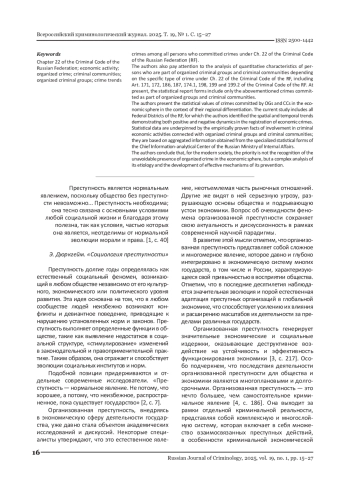 Предлагаемое исследование фокусируется на имманентно присущей современной России проблематике организованной преступности в сфере экономической деятельности, рассматривая ее сквозь призму статистико-криминологического анализа. Авторами статьи обосновывается мнение, что организованная преступность является сложным и многомерным явлением, глубоко интегрированным в экономическую систему России, детерминирующую длительно сохраняющийся характер этого негативного феномена. В фокусе внимания статьи - статистический анализ лиц, совершивших преступления в форме организованных преступных групп (ОГ) и преступных сообществ (ПС) в сфере экономической деятельности. В исследовательском материале продемонстрирована доля лиц - участников этих преступлений среди всех лиц, совершивших преступления, предусмотренных гл. 22 УК РФ. Авторы акцентируют внимание также на анализе количественных характеристик лиц в составе организованных преступных групп и преступных сообществ по отдельным составам преступлений, предусмотренных гл. 22 УК РФ, включая ст. 171, 172, 186, 187, 174.1, 198, 199 и 199.2 УК РФ. По состоянию на данный период времени статистические формы учета фиксируют исключительно указанные составы преступлений, совершенные в форме организованных групп и преступных сообществ. В статье также продемонстрировано статистическое измерение преступлений, совершенных ОГ и ПС в сфере экономической деятельности, в контексте региональной дифференциации. Настоящее исследование охватывает все федеральные округа РФ, для которых выявлены пространственно-временные тенденции, демонстрирующие как положительную, так и отрицательную динамику регистрации преступлений в сфере экономической деятельности. Статистические данные основаны на эмпирически подтвержденных фактах участия в преступной экономической деятельности, связанной с организованными преступными группами и преступными сообществами, и опираются на агрегированную информацию, полученную из специализированных форм статистического учета, предоставленных ГИАЦ МВД России. Авторы приходят к выводу, что приоритетной задачей современного общества является не признание неизбежности организованной преступности в сфере экономической деятельности, а комплексный анализ ее этиологии и разработка действенных механизмов превенции.