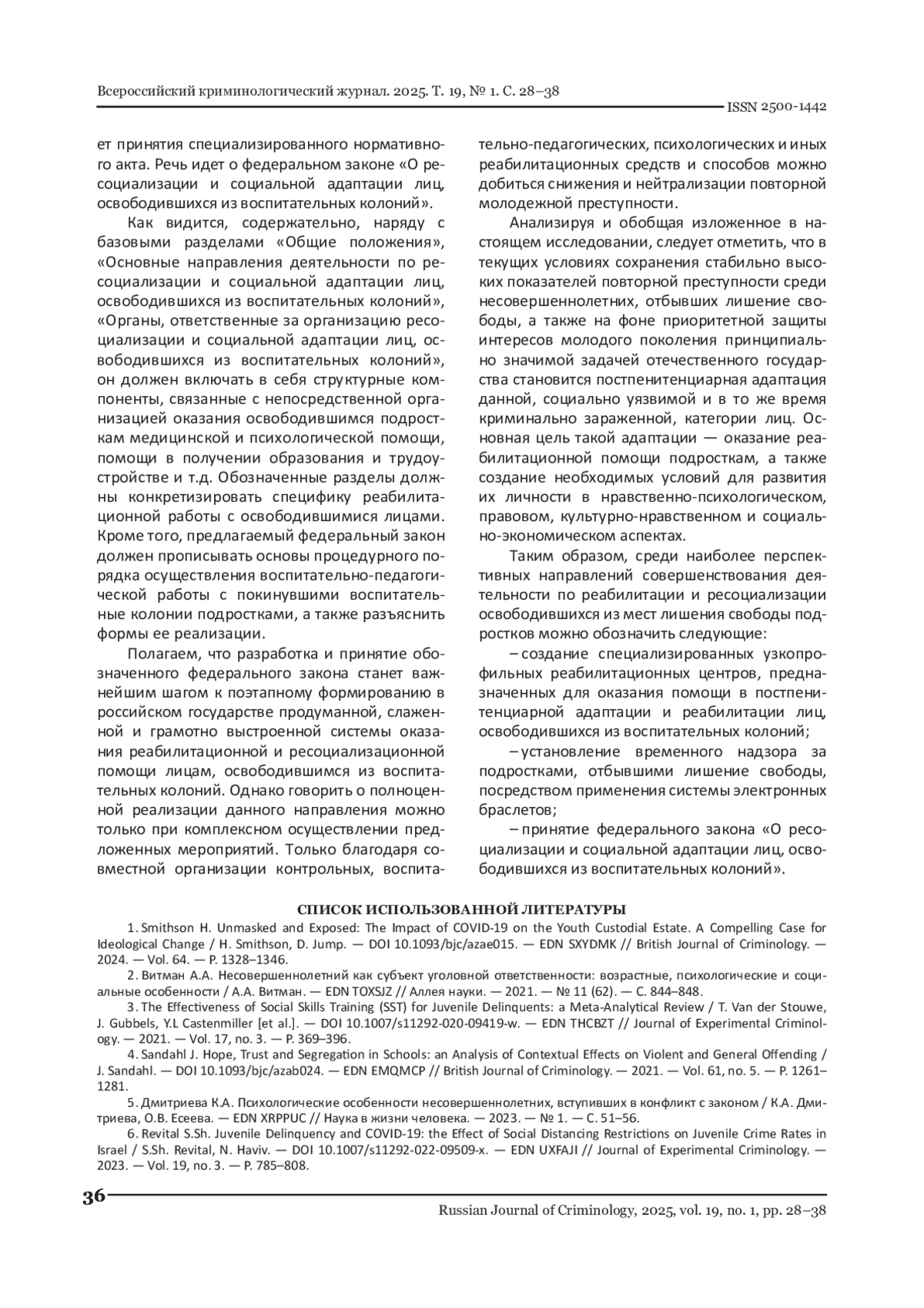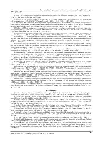 1. Смитсон Х. Разоблачение и раскрытие: Влияние COVID-19 на систему содержания под стражей несовершеннолетних. Убедительный аргумент в пользу идеологических изменений / Х. Смитсон, Д. Джамп. 10.1093/bjc/azae015. // Британский журнал криминологии. - 2024. - Том 64. - С. 1328-1346. DOI: 10.1093/bjc/azae015.BritishJournalofCriminology.-2024.-Vol.64.-P.1328-1346 EDN: SXYDMK