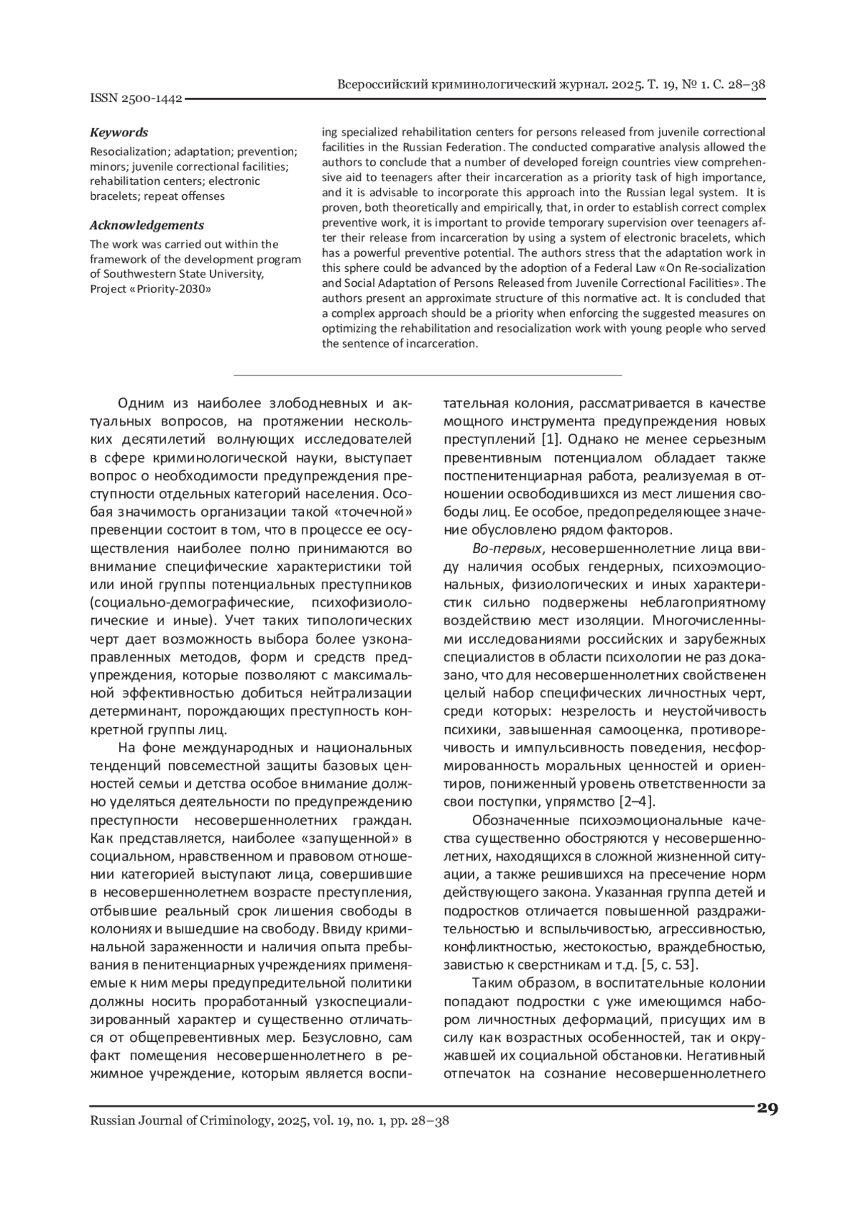 Наиболее эффективными средствами борьбы с преступностью несовершеннолетних признаются частнопревентивные меры, адресованные непосредственно к данной социальной уязвимости категории населения. В статье обоснована необходимость налаживания постпенитенциарной работы, реализуемой в отношении освободительных изтельных воспитателей колоний лиц. Предметом исследования серьезных проблем сохранения девиантного и делинквентного поведения у подростков, покинувших место лишения свободы и нужды в особом социально-психологическом, правовом и педагогическом сопровождении со стороны государства. Специфика географических и последствий особенностей несовершеннолетних королевств, сохранение стабильных показателей их повторяемости преступности, а также слабый уровень организации ресоциализационной работы в обеспечении необходимости создания в РФ специализированных профильных центров реабилитации для лиц, освободившихся из воспитательных колоний. Проведенный сравнительный анализ позволяет сделать вывод о том, что в ряде случаев оказываемая странами всесторонняя помощь подросткам, отбывшим свободу свободы, играет приоритетную роль в особой важности, которую лидер трансформирует и в российскую правовую систему. В целях грамотного построения комплексной предупредительной работы на теоретическом и эмпирическом уровне доказана первоначательность временного надзора за лишением свободы подростками посредством применения системы электронных браслетов, обладающих мощным превентивным потенциалом. Авторами отмечается, что активизация адаптационной работы в рассматриваемом направлении позволяет принять федеральный закон «О ресоциализации и социальной адаптации лиц, освободившихся из воспитательных колоний». В статье разработана примерная структура предлагаемого нормативного акта. Делается вывод о приоритетности комбинированного подхода к применению предложенных мер по оптимизации реабилитационной и ресоциализационной работы с постепенной ликвидацией, отбывшей явление в виде лишения свободы.