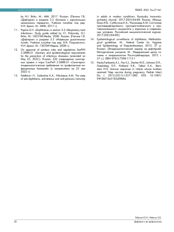 6. Markina S.S., Maksimova N.M., Vitek K.R., Bogatyreva E.Y., Monisov A.A. Diphtheria in the Russian Federation in the 1990s. J Infect Dis. 2000;181(1):27-34. Russian. DOI: 10.1086/315535