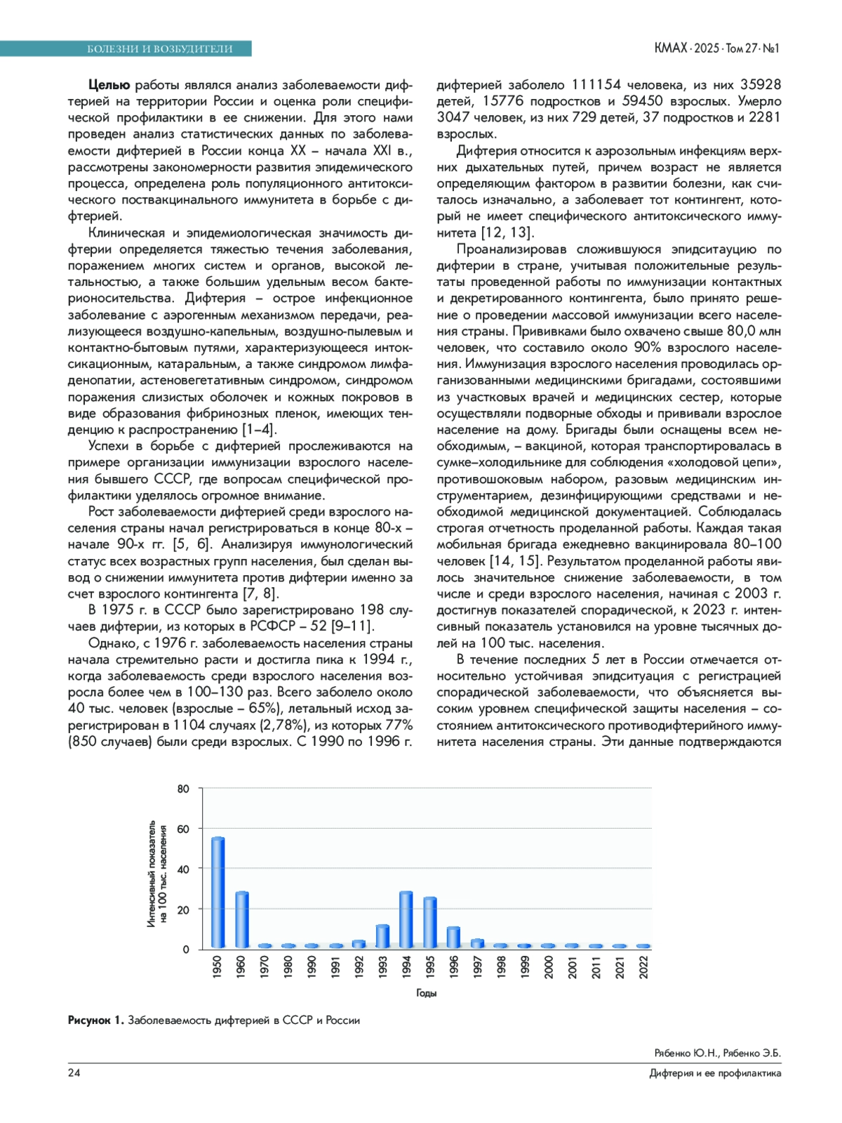 В статье проведен анализ статистических данных заболеваемости дифтерией на территории России конца ХХ – начала ХХI в., приведены абсолютные и относительные интенсивные показатели заболеваемости в целом в стране, рассмотрены закономерности развития эпидемического процесса, определена роль популяционного антитоксического поствакцинального иммунитета в борьбе с этой грозной инфекцией. Дана сравнительная характеристика заболеваемости в различных возрастных группах населения, а также иммунологического статуса всех возрастных групп, был сделан вывод о снижении иммунитета против дифтерии именно за счет взрослого контингента. Так, к 1975 г. в СССР было зарегистрировано 198 случаев дифтерии. Однако, начиная с 1976 г. заболеваемость начала стремительно расти и достигла пика к 1985 г., когда среди взрослого населения уровень иммунитета не превышал 25%. В 1990-х гг. отмечен новый подъем с пиком, зарегистрированным в 1994 г., когда всего заболело около 40 тыс. человек. С 1990 по 1996 г. дифтерией заболело 111154 человека, из них 35928 детей, 15776 подростков и 59450 взрослых; умерло 3047 человек, из них 729 детей, 37 подростков и 2281 взрослых. Далее прививками было охвачено свыше 80 млн человек, что составило около 90% взрослого населения. В результате было достигнуто значительное снижение заболеваемости, которая, начиная с 2003 г., достигла показателей спорадической, и к 2023 г. интенсивный показатель установился на уровне тысячных долей на 100 тыс. населения. Однако, не смотря на снижение общей заболеваемости дифтерией в стране, она остается актуальной социально-значимой проблемой практического здравоохранения.