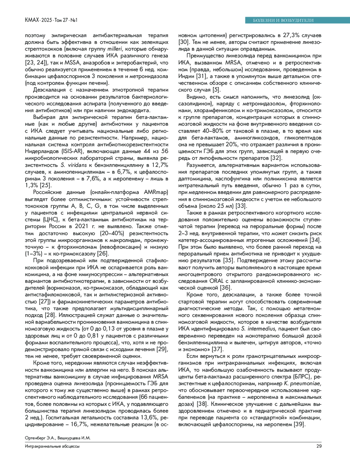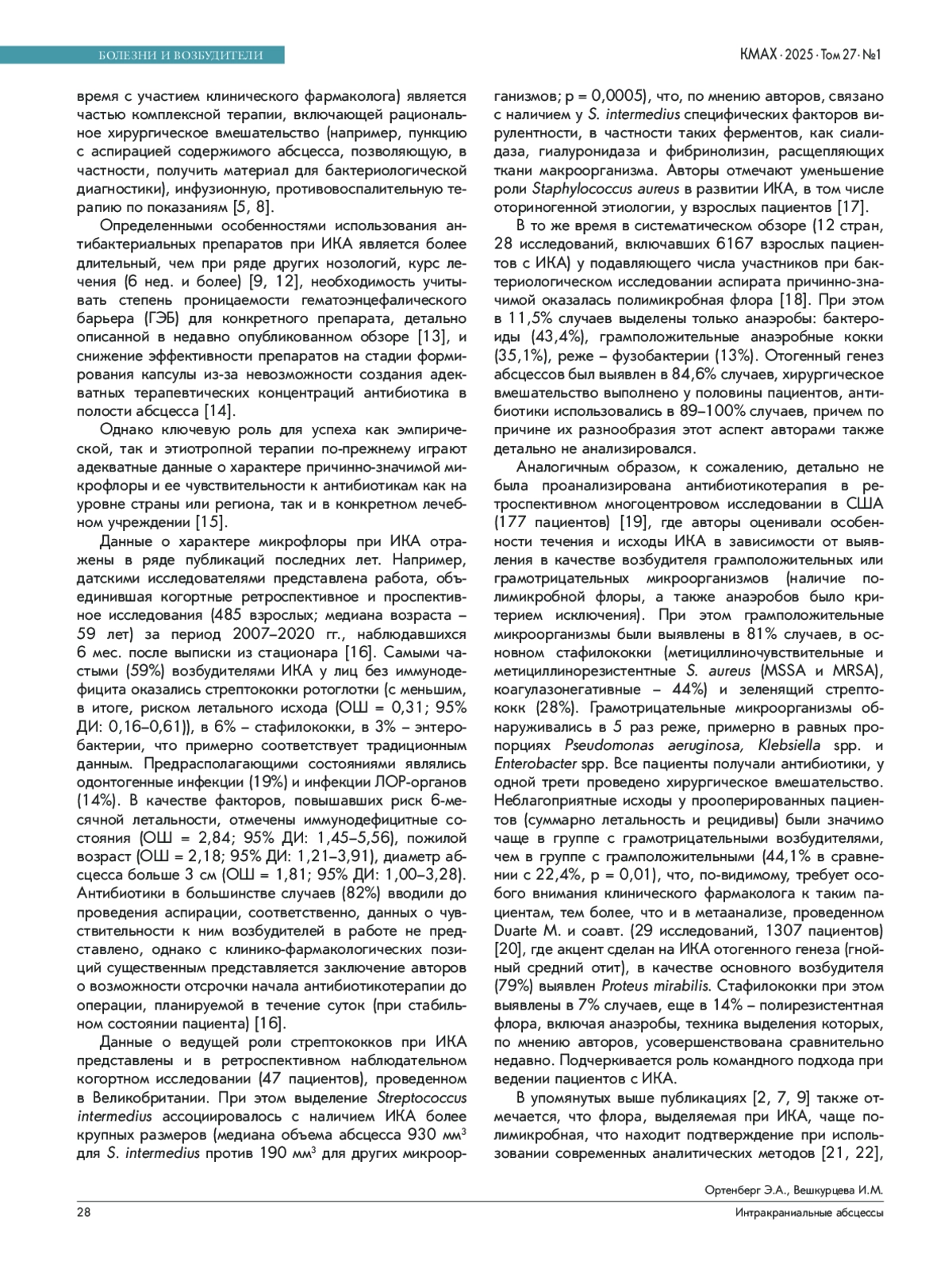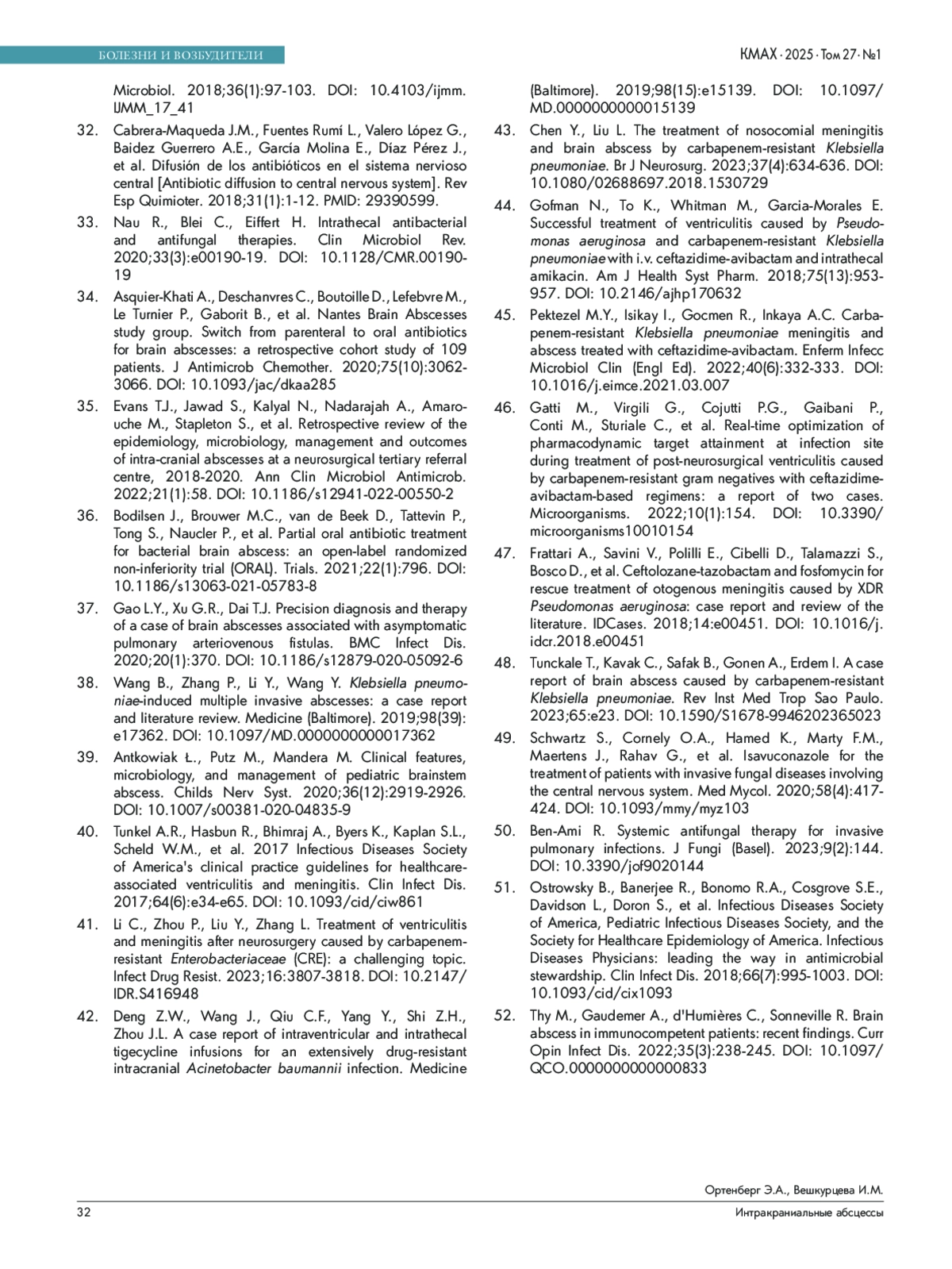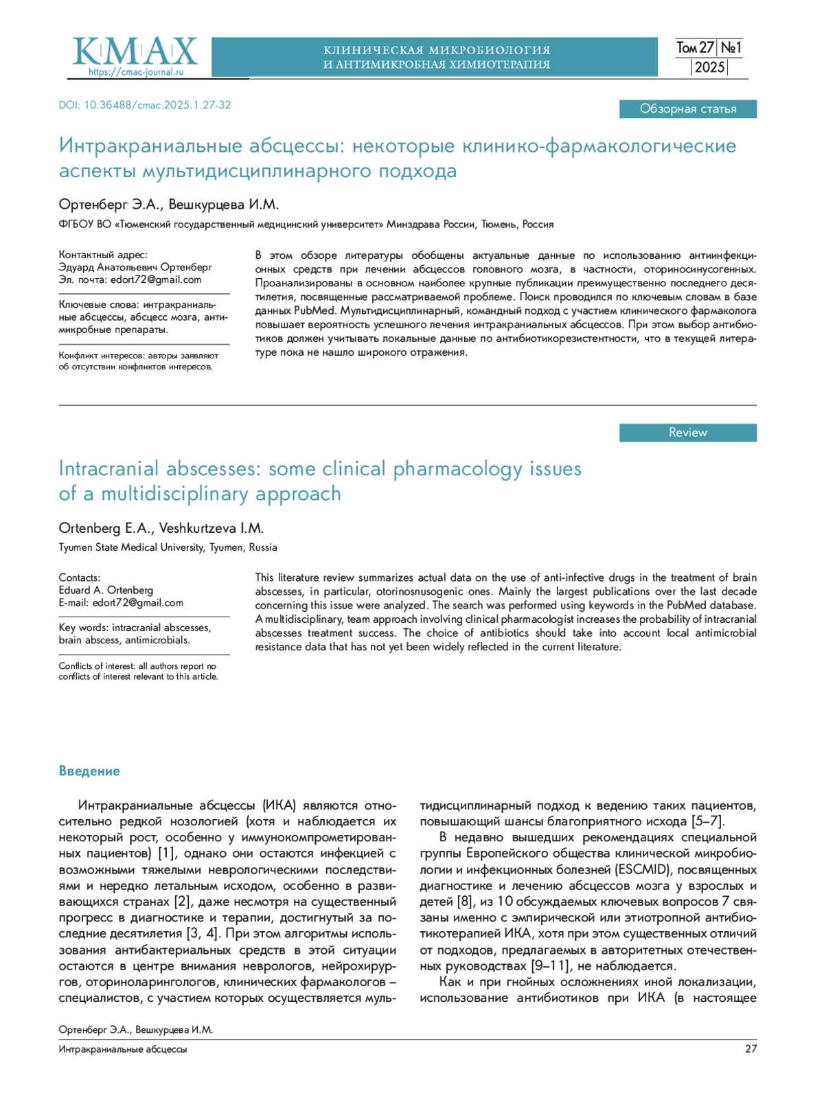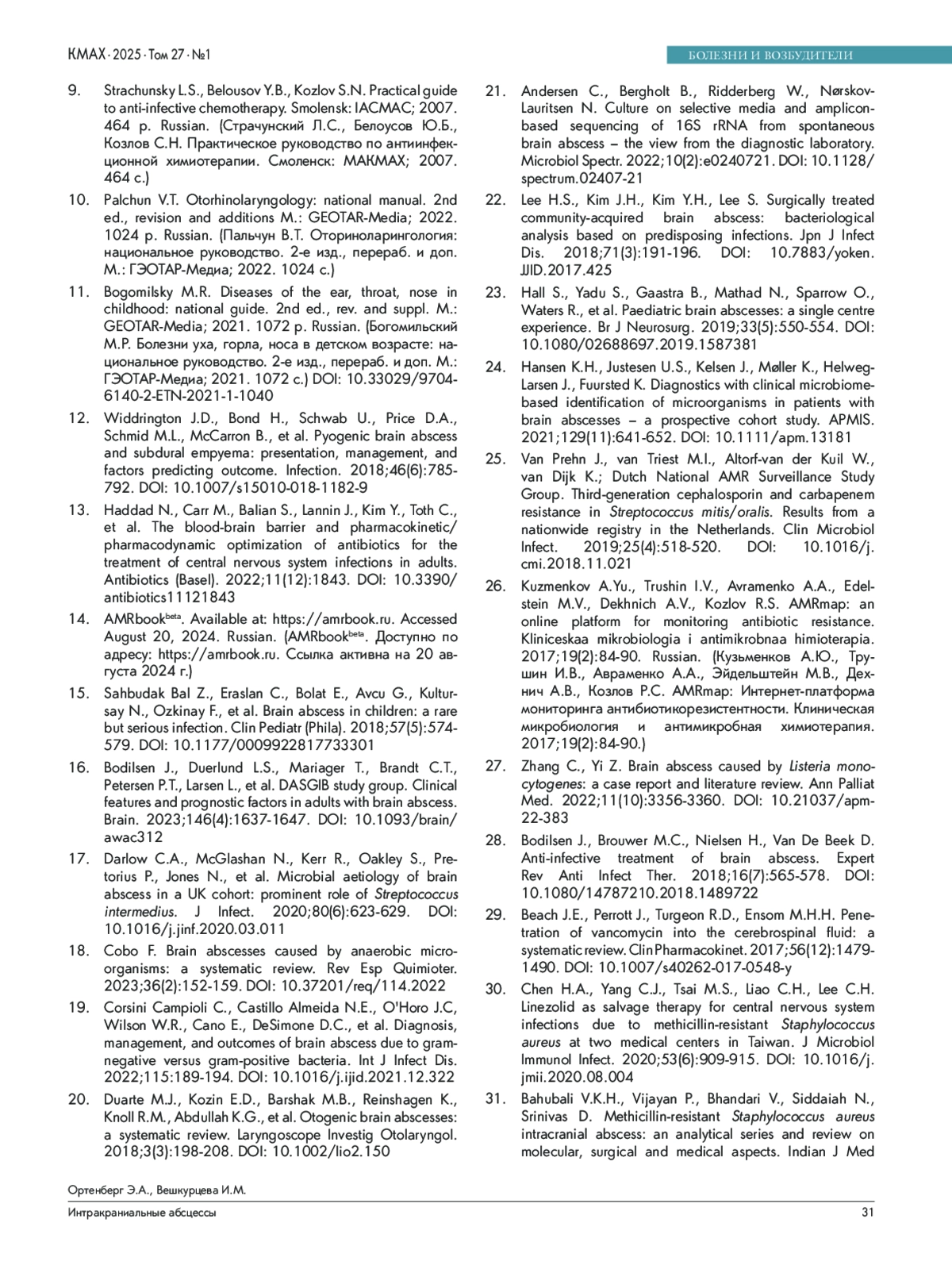 ОРТЕНБЕРГ Э. А., ВЕШКУРЦЕВА И. М. ИНТРАКРАНИАЛЬНЫЕ АБСЦЕССЫ: НЕКОТОРЫЕ КЛИНИКО-ФАРМАКОЛОГИЧЕСКИЕ АСПЕКТЫ МУЛЬТИДИСЦИПЛИНАРНОГО ПОДХОДА // КЛИНИЧЕСКАЯ МИКРОБИОЛОГИЯ И АНТИМИКРОБНАЯ ХИМИОТЕРАПИЯ. 2025. № 1, ТОМ 27