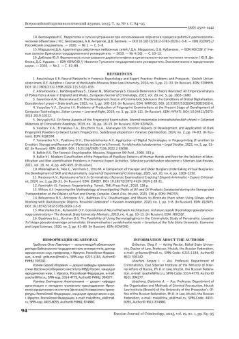 9. Балко В.И. Современная классификация свойств папиллярных узоров рук и ног человека для решения идентификационных и неидентификационных задач в судебно-экспертной деятельности / В.И. Балко. // Сибирское юридическое обозрение. - 2021. - Т. 18, № 4. - С. 445-459. DOI: 10.19073/2658-7602-2021-18-4-445-459 EDN: CFIBKG