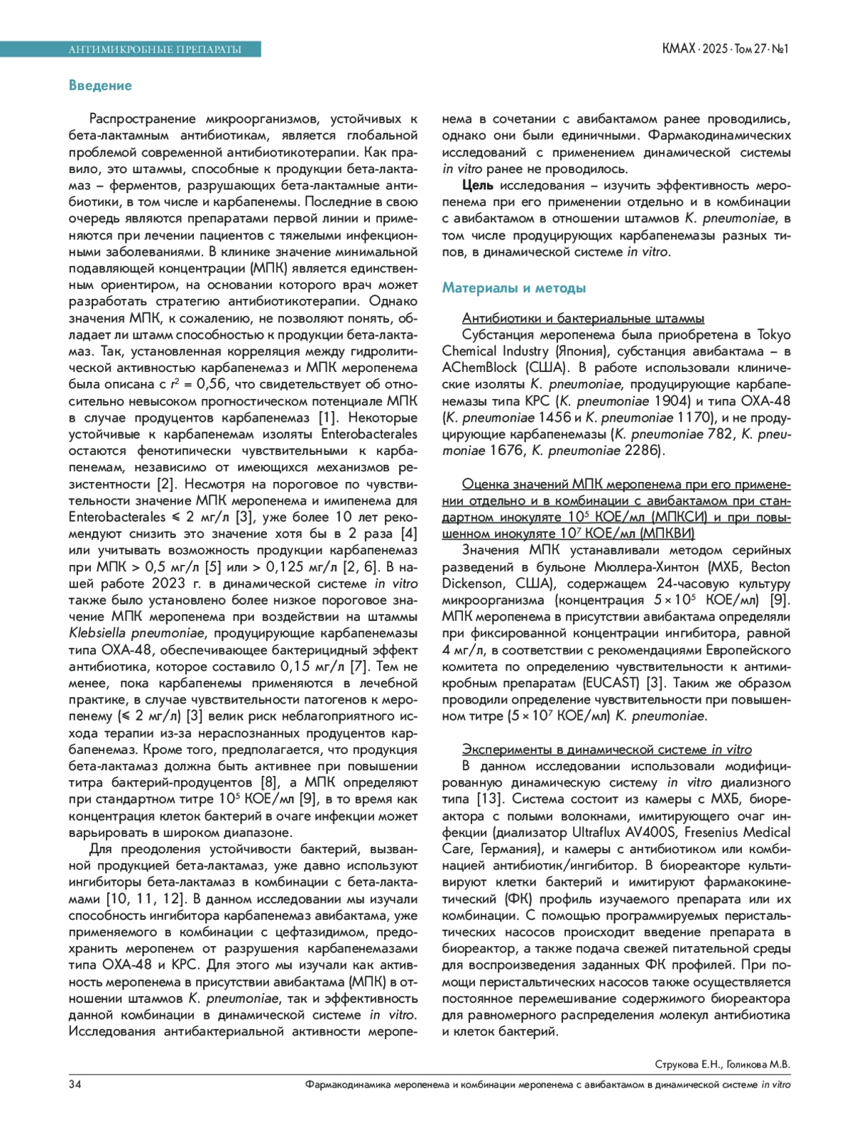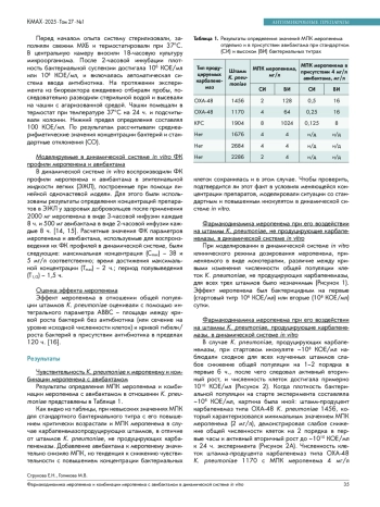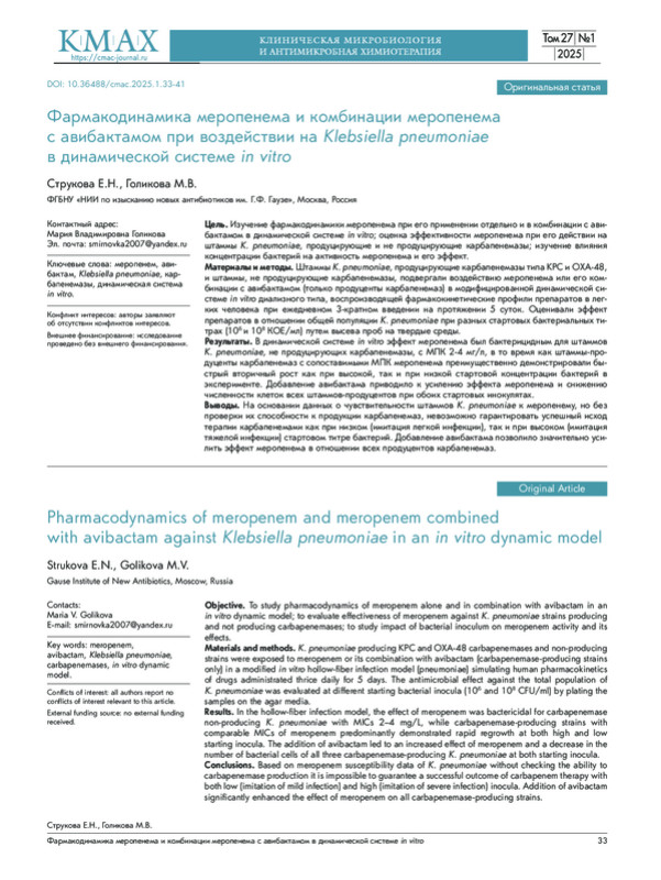 Статья: Фармакодинамика меропенема и комбинации меропенема с авибактамом при воздействии на Klebsiella pneumoniae в динамической системе in vitro (2025)