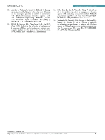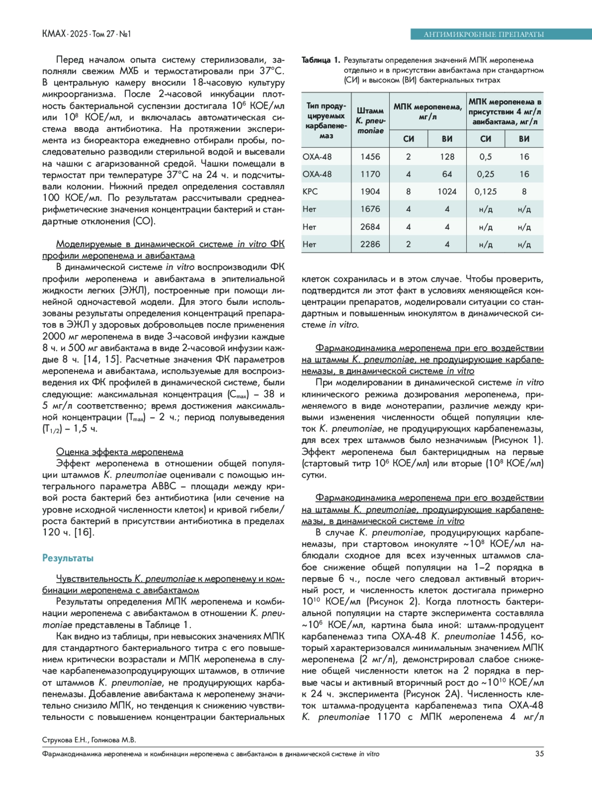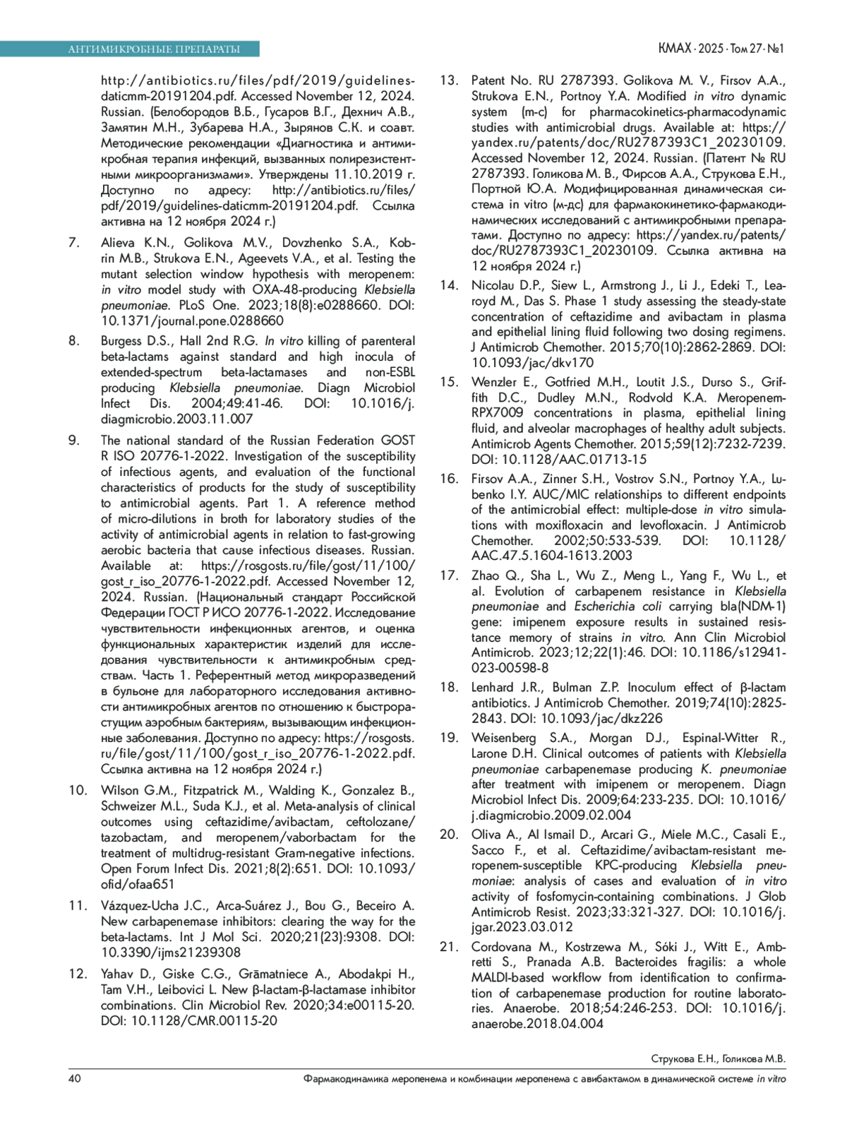 ГОЛИКОВА М. В., СТРУКОВА Е.Н. ФАРМАКОДИНАМИКА МЕРОПЕНЕМА И КОМБИНАЦИИ МЕРОПЕНЕМА С АВИБАКТАМОМ ПРИ ВОЗДЕЙСТВИИ НА KLEBSIELLA PNEUMONIAE В ДИНАМИЧЕСКОЙ СИСТЕМЕ IN VITRO // КЛИНИЧЕСКАЯ МИКРОБИОЛОГИЯ И АНТИМИКРОБНАЯ ХИМИОТЕРАПИЯ. 2025. № 1, ТОМ 27