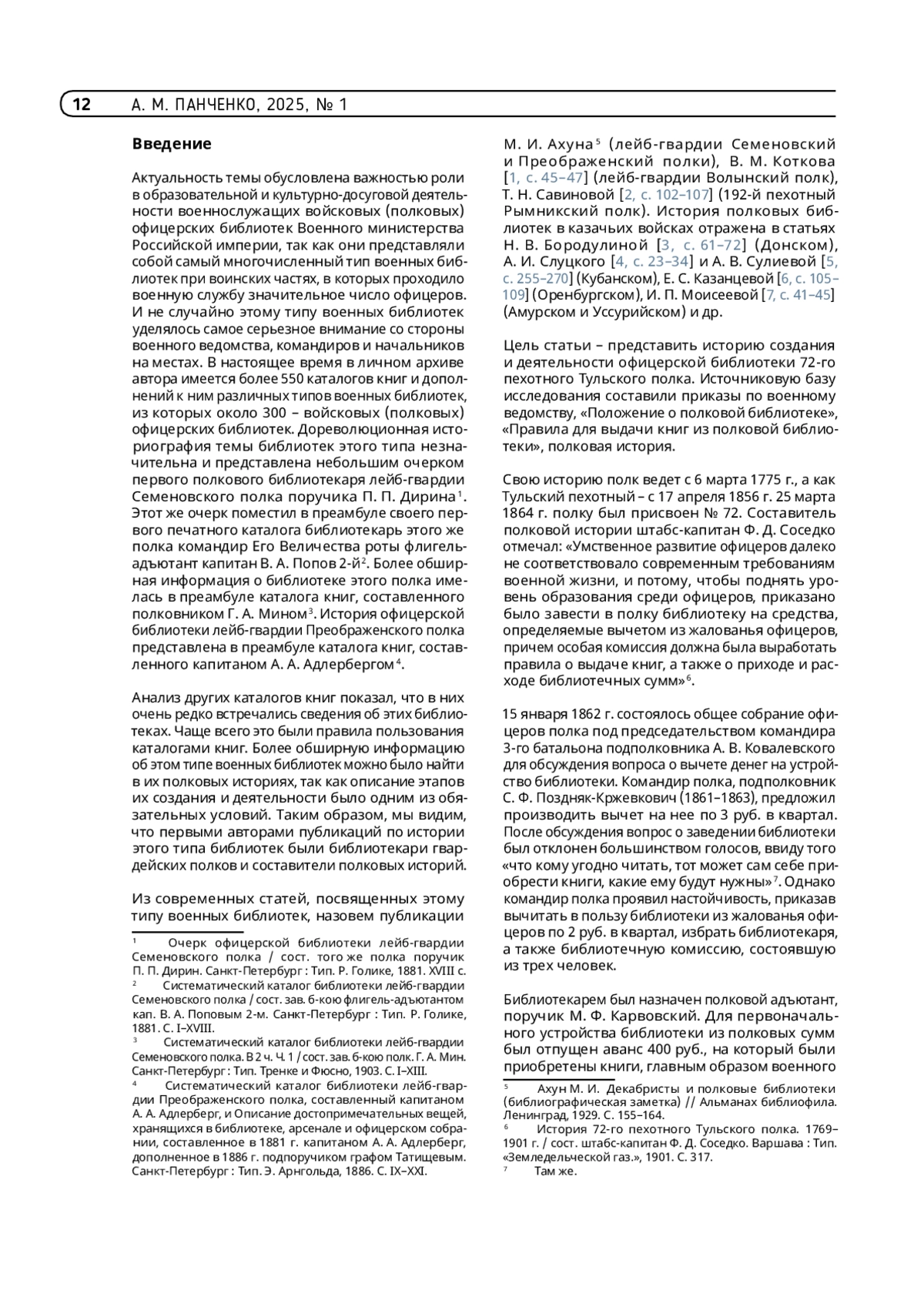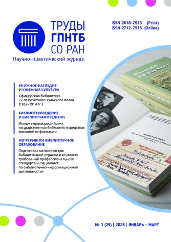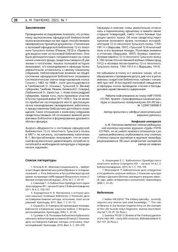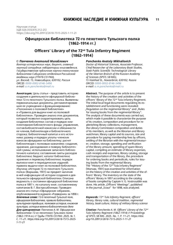 ПАНЧЕНКО А. М. ОФИЦЕРСКАЯ БИБЛИОТЕКА 72-ГО ПЕХОТНОГО ТУЛЬСКОГО ПОЛКА (1862–1914 ГГ.) // ТРУДЫ ГПНТБ СО РАН. 2025. № 1