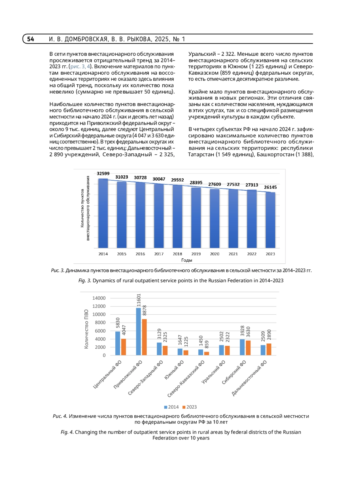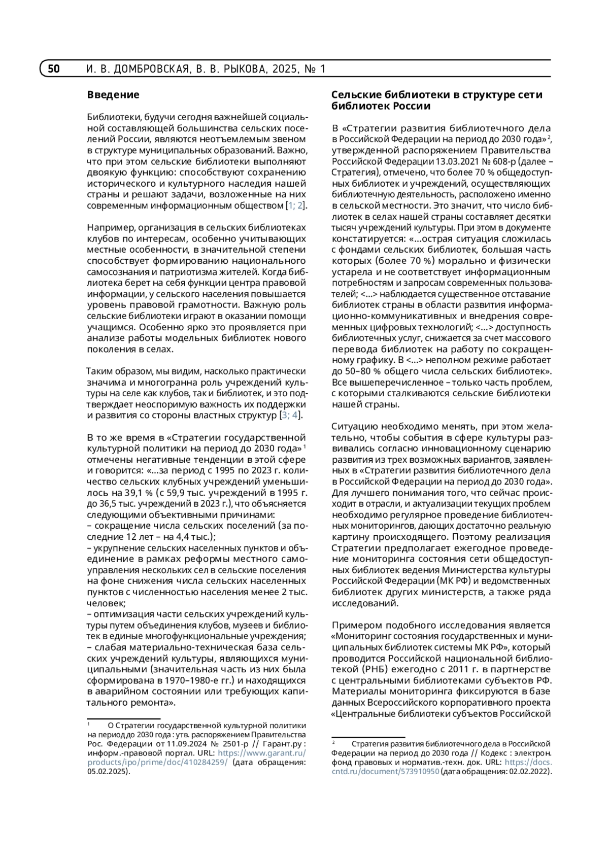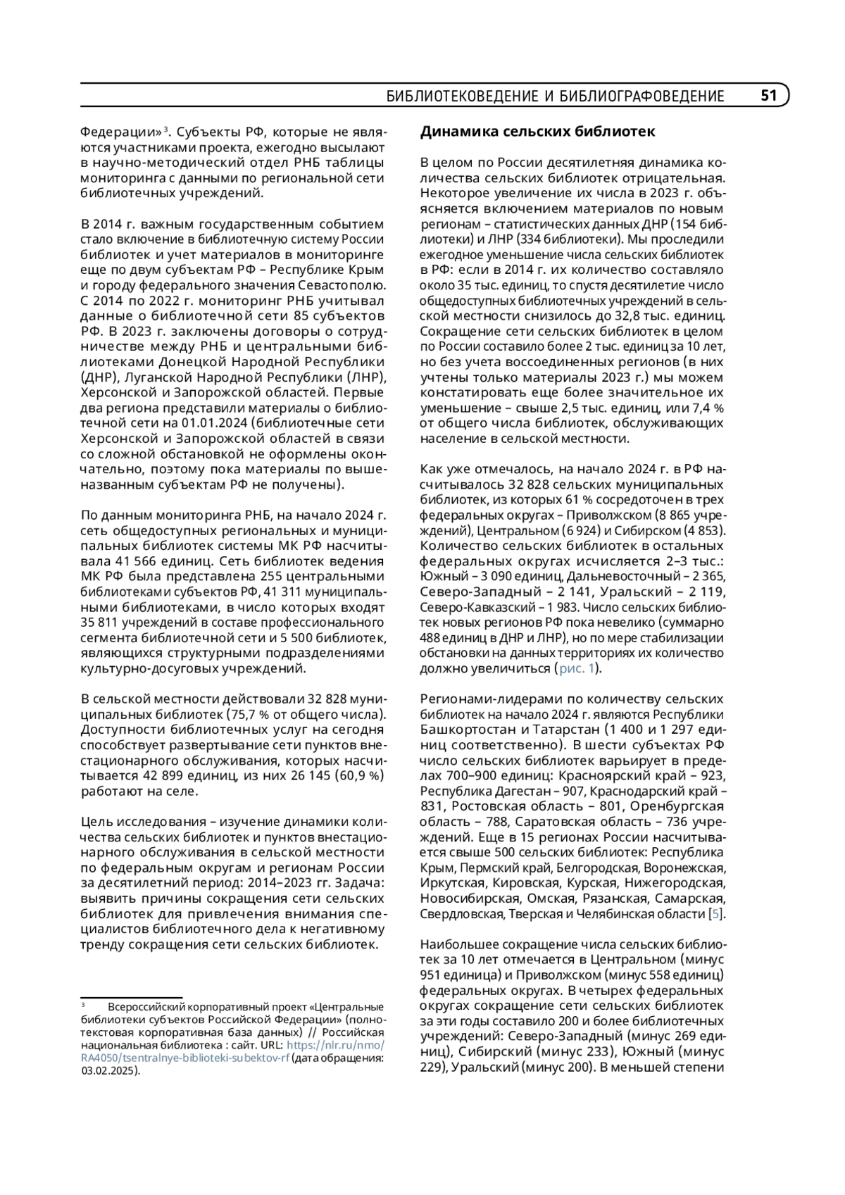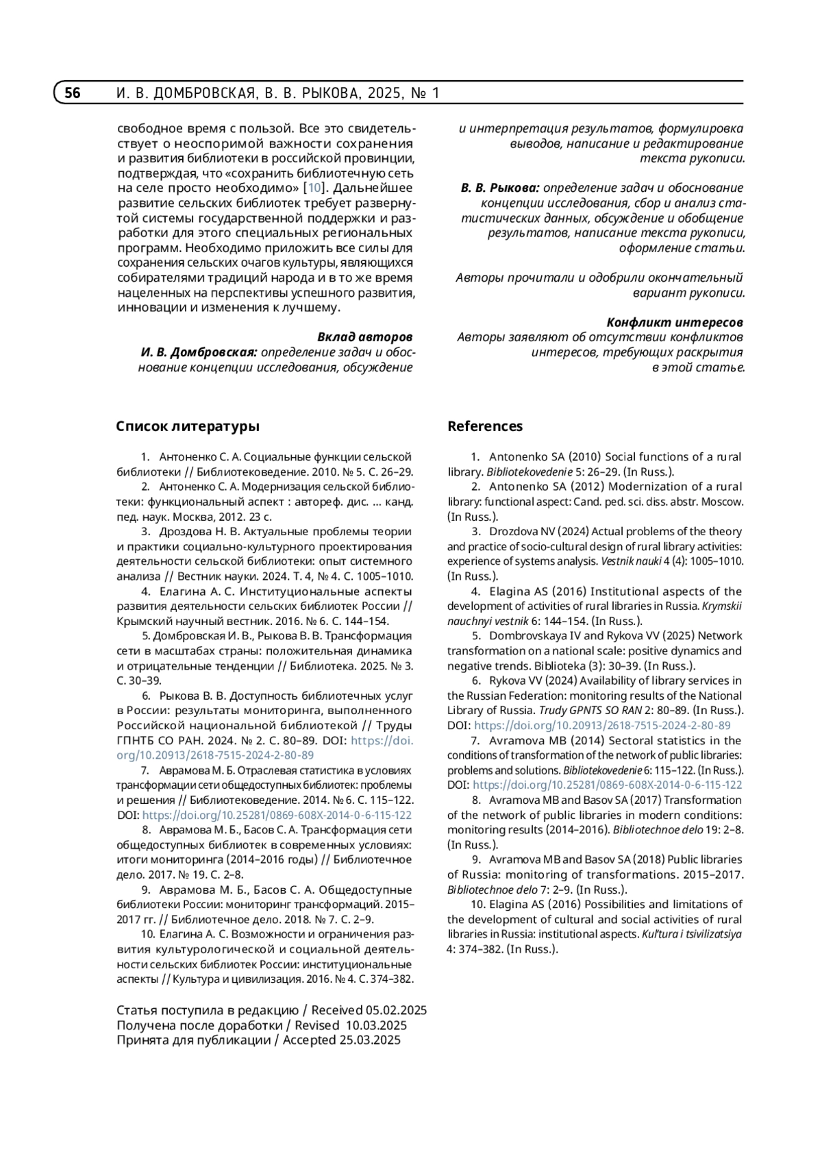 5. Домбровская И. В., Рыкова В. В. Трансформация сети в масштабах страны: положительная динамика и отрицательные тенденции // Библиотека. 2025. № 3. С. 30-39.
