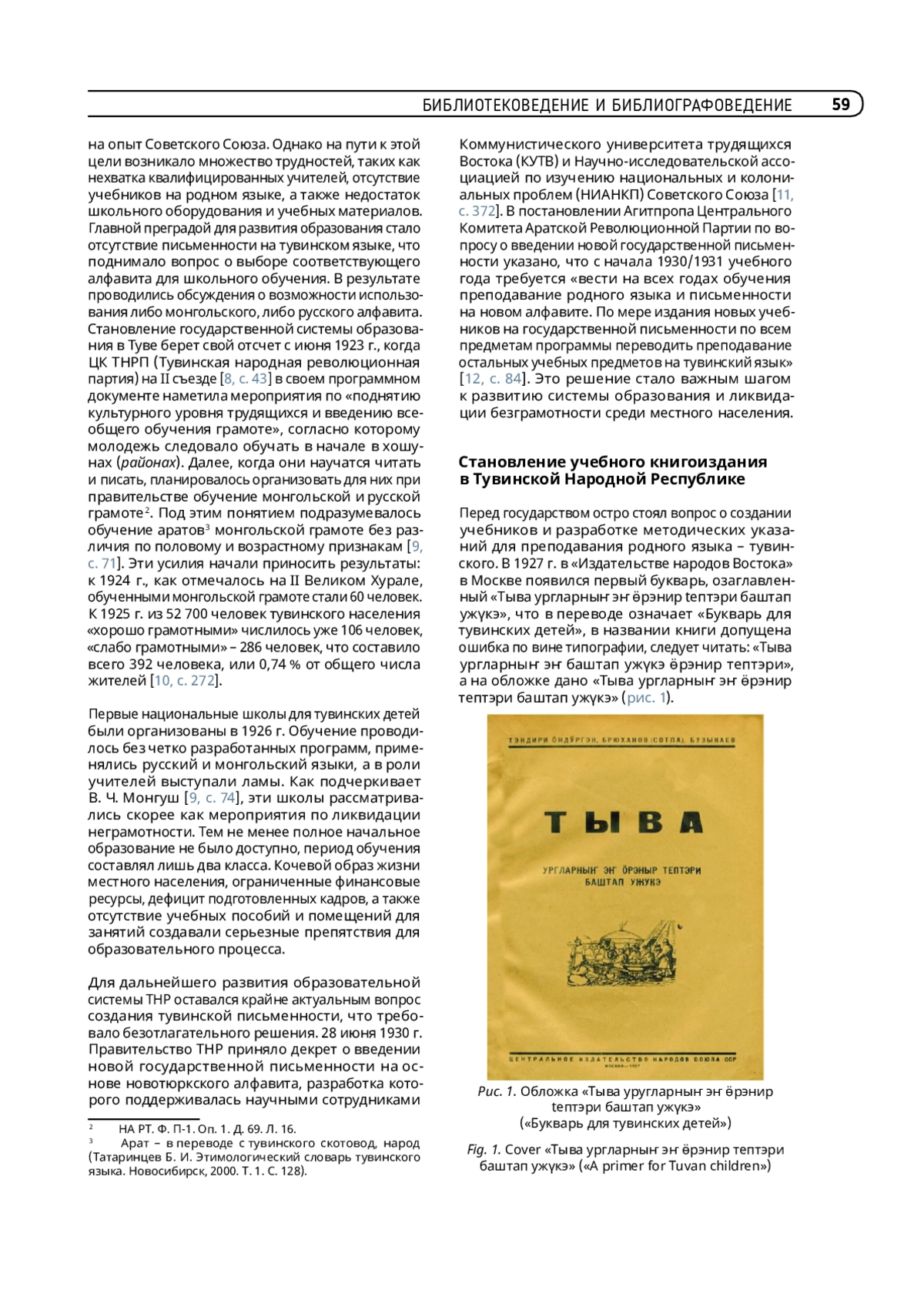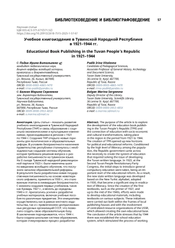 Цель статьи – показать развитие учебного книгоиздания в Тувинской Народной Республике (ТНР) и связь образования с социально- экономическими и культурными изменениями, происходившими в регионе с 1921 по 1944 гг.