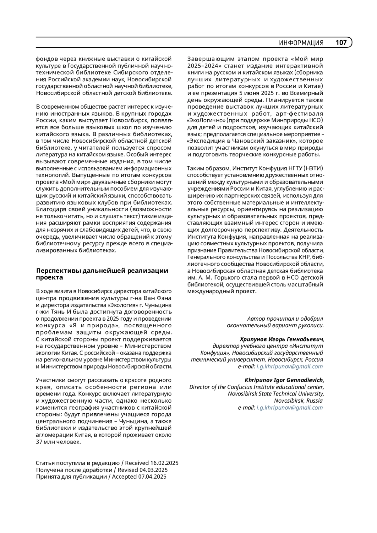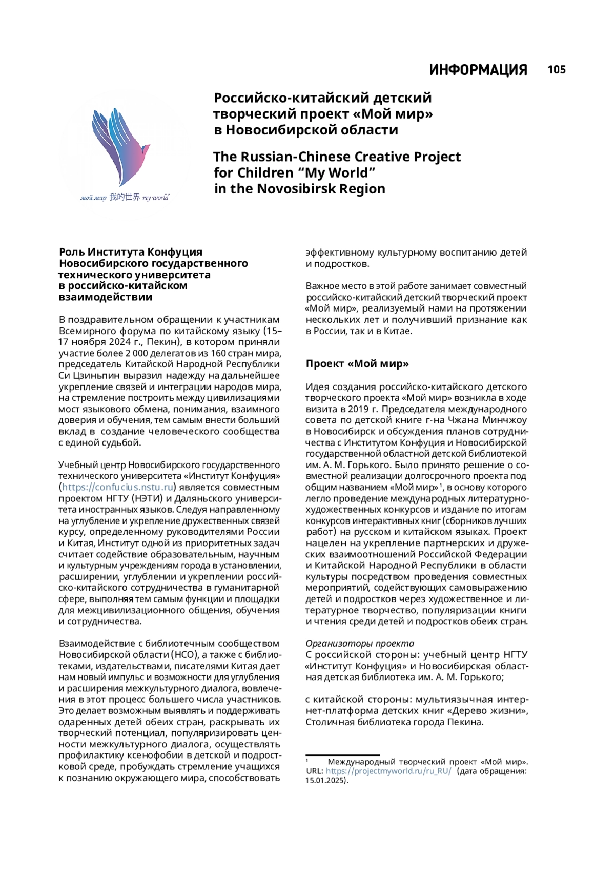 Для цитирования: Хрипунов И. Г. Российско-китайский детский творческий проект «Мой мир» в Новосибирской области. Труды ГПНТБ СО РАН. 2025;(1):105-107.
