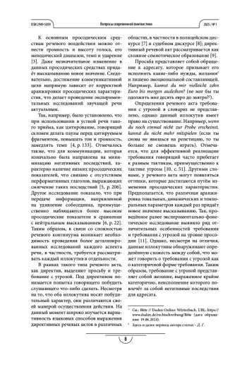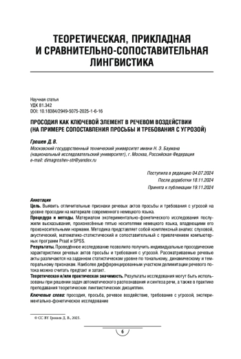 Цель. Выявить отличительные признаки речевых актов просьбы и требования с угрозой на уровне просодии на материале современного немецкого языка.