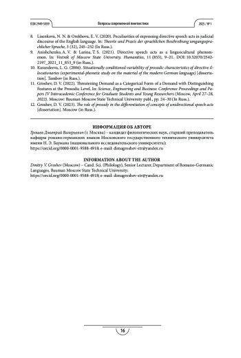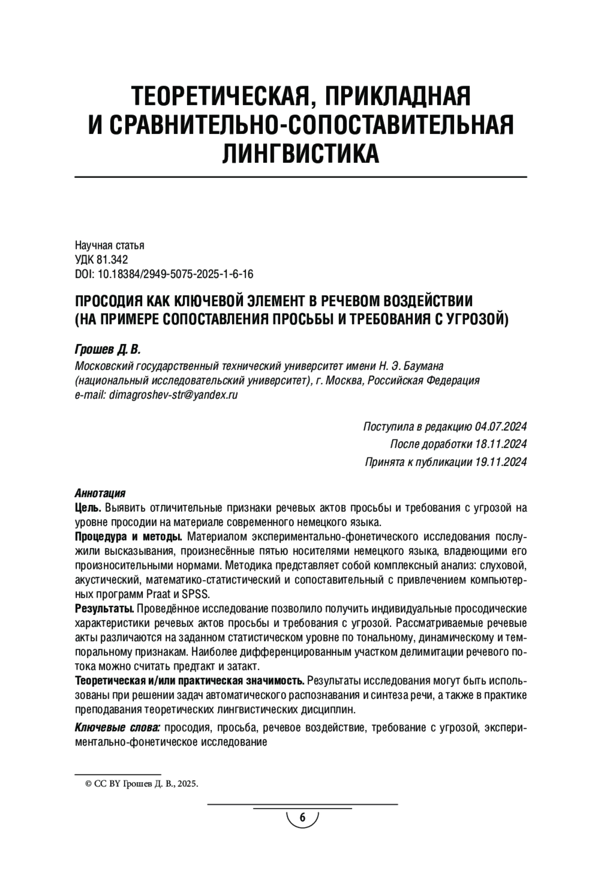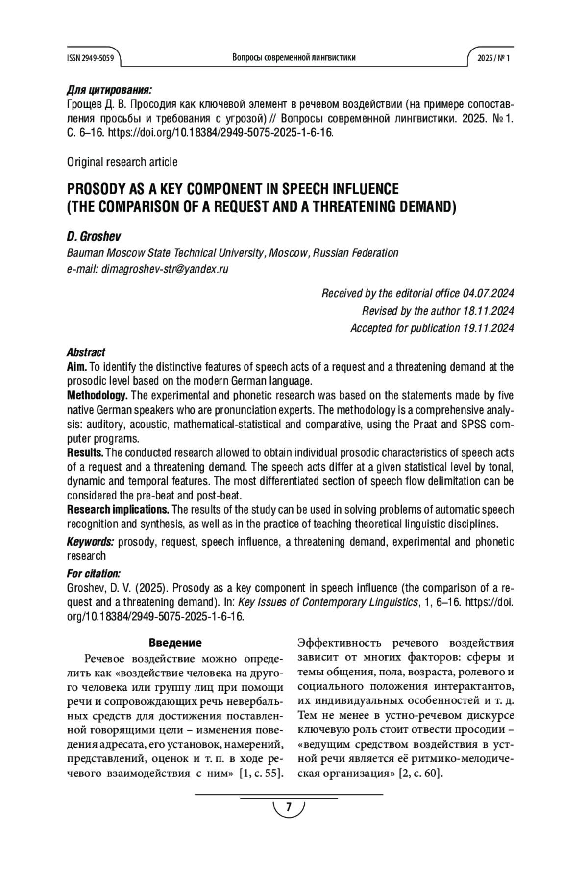 11. Грошев Д. В. Угрожающее требование как категоричная форма требования с отличительными особенностями на уровне просодии (Threatening Demand as a Categorical Form of a Demand with Distinguishing Features at the Prosodic Level) // Наука, технологии и бизнес: IV Межвузовская конференция аспирантов, соискателей и молодых учёных (Москва, 27-28 апреля 2022 г.) = Science, Engineering and Business: Conference Proceedings and Papers IV Interacademic Conference for Graduate Students and Young Researchers (Moscow, April 27-28, 2022). М.: Издательство МГТУ им. Н. Э. Баумана, 2022. С. 24-30. EDN: OOJLON