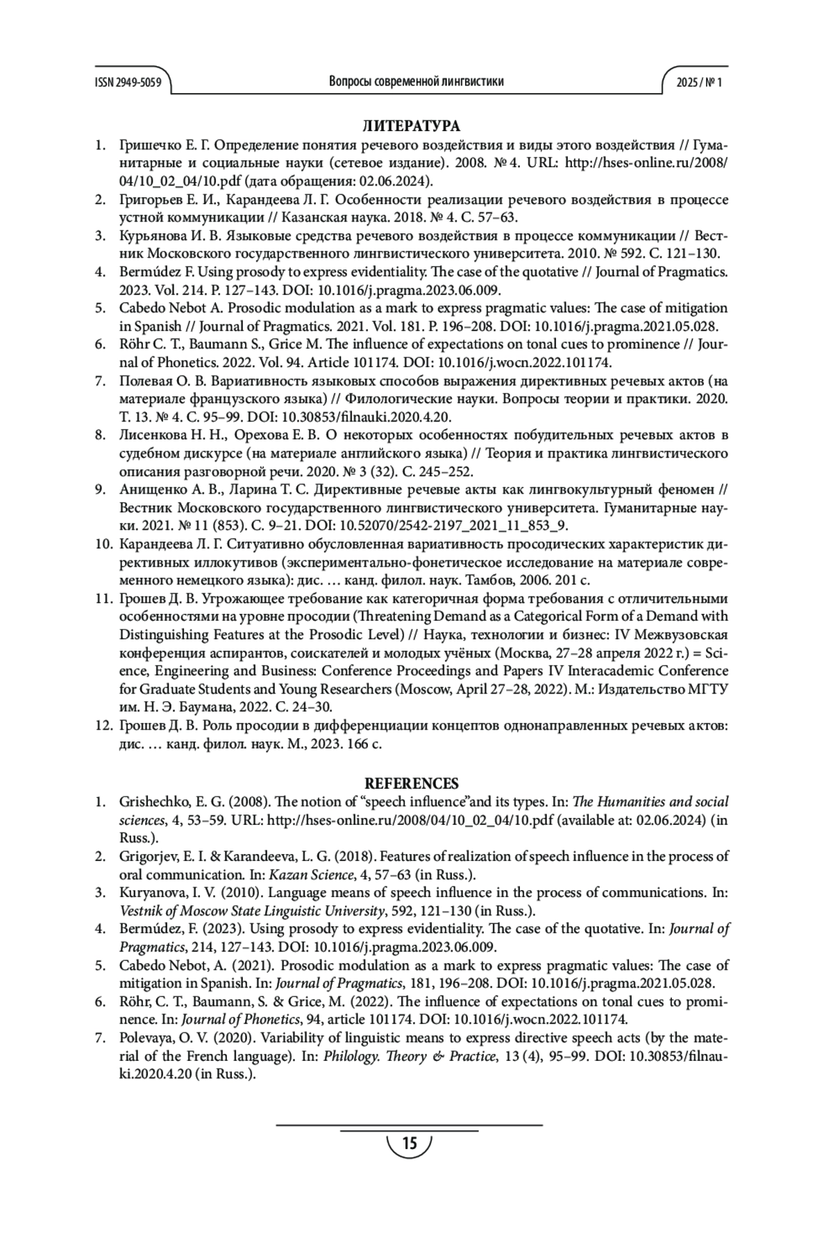 4. Bermúdez F. Using prosody to express evidentiality. The case of the quotative // Journal of Pragmatics. 2023. Vol. 214. P. 127-143. DOI: 10.1016/j.pragma.2023.06.009