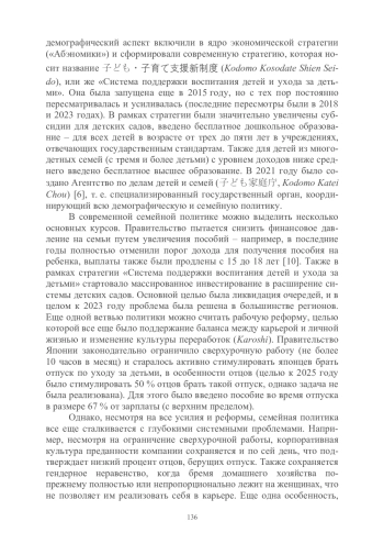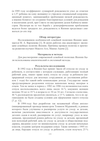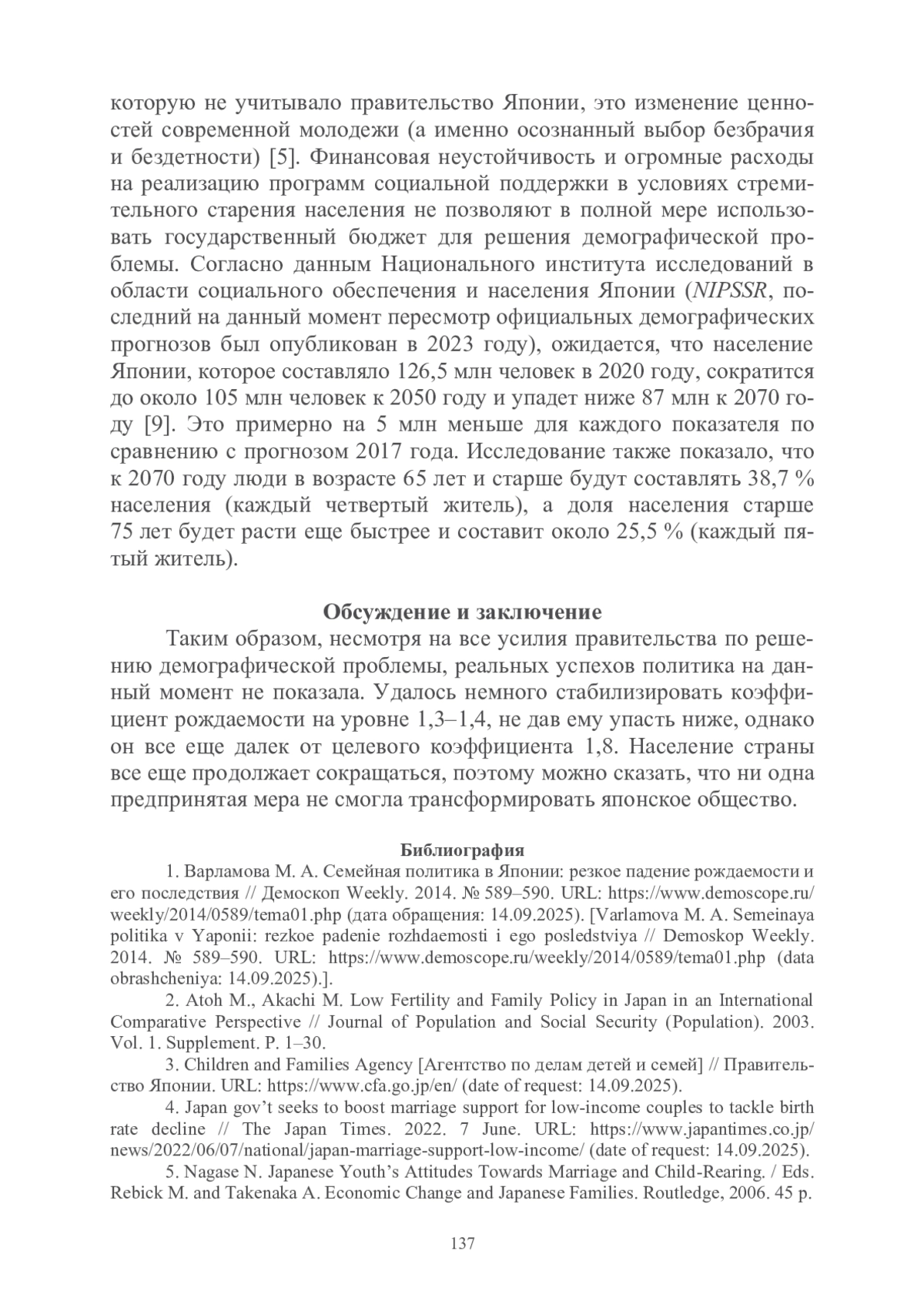 1. Варламова М. А. Семейная политика в Японии: резкое падение рождаемости и его последствия // Демоскоп Weekly. 2014. № 589-590. URL: https://www.demoscope.ru/weekly/2014/0589/tema01.php (дата обращения: 14.09.2025). EDN: VRNPDP