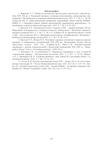 2. Вахитов Р. Р. Отношения России и Турции в XIX - первой половине XX вв. Миролюбие консерватизма и конфликтогенность либерализма // Проблемы цивилизационного развития 2023. Т. 5. № 1. С. 90-113. EDN: YSHCIQ