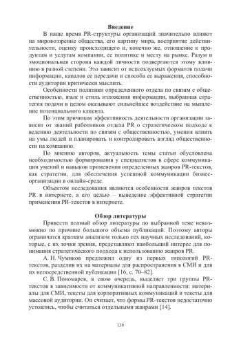 Статья посвящена исследованию жанрового разнообразия PR-текстов в цифровой среде и их применению в бизнес-коммуникациях. В ней проводится комплексный анализ особенностей формирования типологии PR-материалов в интернет-пространстве, рассматриваются специфические характеристики различных жанровых форм и модели их использования в онлайн-коммуникациях. Особое внимание уделяется разработке эффективной стратегии публикационной деятельности PR-служб в интернет-пространстве. Авторы предлагают оригинальную иерархию наиболее востребованных жанров PR-текстов для малого бизнеса и выявляют ключевую особенность современных PR-материалов - их жанровый полиформизм. Исследование направлено на практическое применение полученных результатов в деятельности PR-специалистов и может быть полезно как теоретикам, так и практикам в области корпоративных коммуникаций.