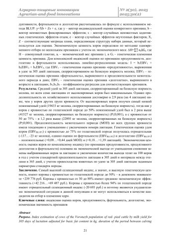 Результаты. Средний удой за 305 дней лактации, скорректированный на базисную жирность молока, по всем семи лактациям от высококровных коров был максимальным. Однако продолжительность их хозяйственного использования достоверно в 2,9 раза (на 4 лактации) ниже, чем у коров других групп кровности. От высококровных коров получен самый низкий пожизненный удой (19433 кг молока, скорректированных на базисную жирность), тогда как у коров с кровностью по голштинской породе до 50% пожизненный удой был в 2 раза выше (41527 кг молока, скорректированных на базисную жирность) (Р≤0,001), а с кровностью от 50 до 75% - в 1,2 раза выше (22893 кг молока, скорректированных на базисную жирность) (Р≤0,001). Продолжительность межотельного периода (МОП) во всех группах кровности имела тенденцию к уменьшению с увеличением номера лактации. Генетическая оценка удоя коров (EBVBLUP1) с кровностью до 75% по голштинской породе получилась отрицательная (-137…-23 кг молока), однако оценки по фертильности (EBVBLUP2) и долголетию (EBVBLUP3) - положительные (+0,08…+0,44 дней МОП) и (+0,18…+1,39 лактаций). Экономическая ценность оценки коров по комплексному индексу (по признакам продуктивности, продуктивного долголетия и фертильности) основана на экономической выгоде от уменьшения снижения замены выбракованных коров за лактацию и увеличении количества выхода телят на 100 коров в год с учетом стандартной продолжительности лактации в 305 дней и интервала между отелами в 365 дней, с учетом превосходства животных по удою за 305 дней лактации заданным параметрам стандарта породы.