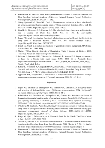 Заключение. Самый высокий селекционный индекс, а значит, и высокую генетическую ценность, имеют коровы с кровностью по голштинской породе до 50% - в денежном эквиваленте +239 776 руб. Коровы с кровностью от 50 до 88% имеют среднюю экономическую эффективность (+42 216…+69 487 руб.). Коровы с кровностью более 94% по голштинской породе имеют отрицательный селекционный индекс (-20 693 руб.) и поэтому являются ухудшателями экономической ситуации в данной популяции и не могут использоваться в качестве кандидатов на отбор в племенное ядро.