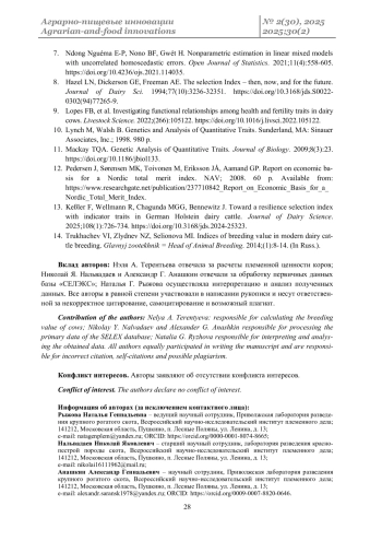 Материалы и методы. В оценке использовалась данные из ИАС «СЕЛЭКС. Молочный скот» по живым коровам красно-пестрой породы (7689 голов) из 15 племенных хозяйств Воронежской области 2008-2021 года рождения. Племенная ценность коров по признакам продуктивности, фертильности и долголетия рассчитывалась по формуле с использованием метода BLUP: y=Xb + Zs + e, где y - вектор индивидуальной оценки конкретного признака; b - вектор неизвестных фиксированных эффектов; s - вектор случайных неизвестных аддитивных генетических эффектов отцов; e - вектор случайных эффектов неучтенных факторов; X, Z - соответствующие матрицы плана, определяющие структуру набора данных, который используется для оценки. Экономическую ценность коров определяли по методике одновременного отбора по нескольким признакам с учетом их экономического веса: ∆Н=1naᵢ∆Gᵢ, где Н - совокупный генотип, aᵢ - экономический веc признака i, и Gi - генетическая племенная ценность признака. Для комплексной индексной оценки по признакам продуктивности, долголетию и фертильности использовалась линейно-регрессионная модель: I = b1EBV1 + b2EBV2 + b3EBV3, где EBV1 - генетическая оценка признака «продуктивность», выраженная в удое за 305 дней лактации, скорректированном на базисную жирность молока; EBV2 - генетическая оценка признака «фертильность», выраженного в продолжительности межотельного периода в днях; EBV3 - генетическая оценка признака «долголетие», выраженного в возрасте в лактациях; b1, b2, b3 - коэффициенты регрессии для соответствующих признаков.