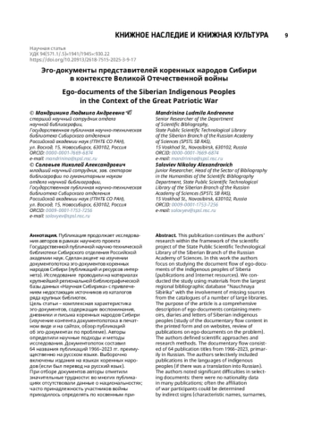 Публикация продолжает исследования авторов в рамках научного проекта Государственной публичной научно-технической библиотеки Сибирского отделения Российской академии наук. Сделан акцент на изучении документопотока эго-документов коренных народов Сибири (публикаций и ресурсов интернета). Исследование проводили на материалах крупнейшей региональной библиографической базы данных «Научная Сибирика» с привлечением недостающих источников из каталогов ряда крупных библиотек.