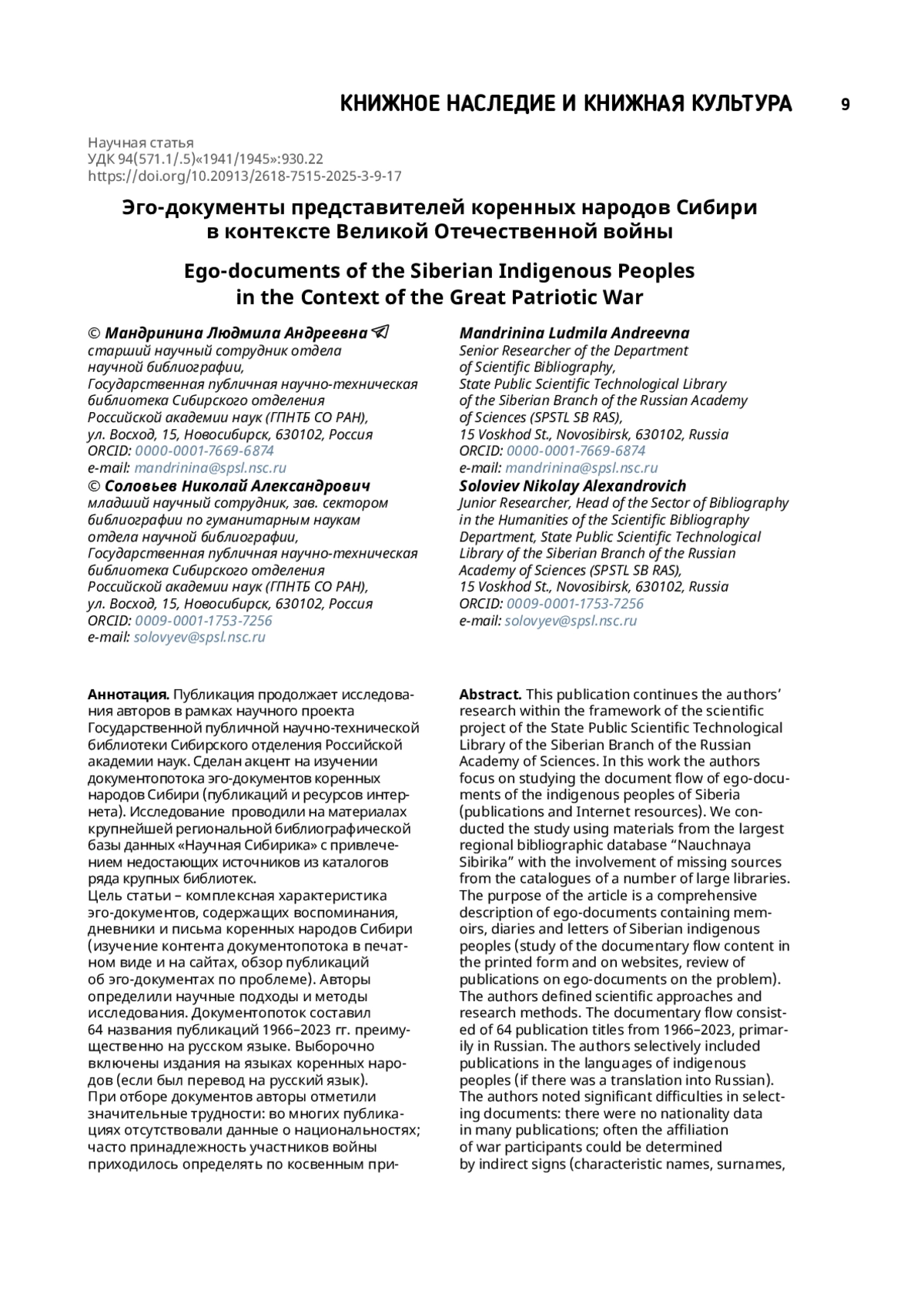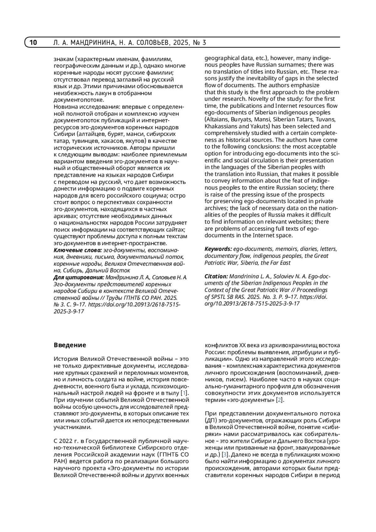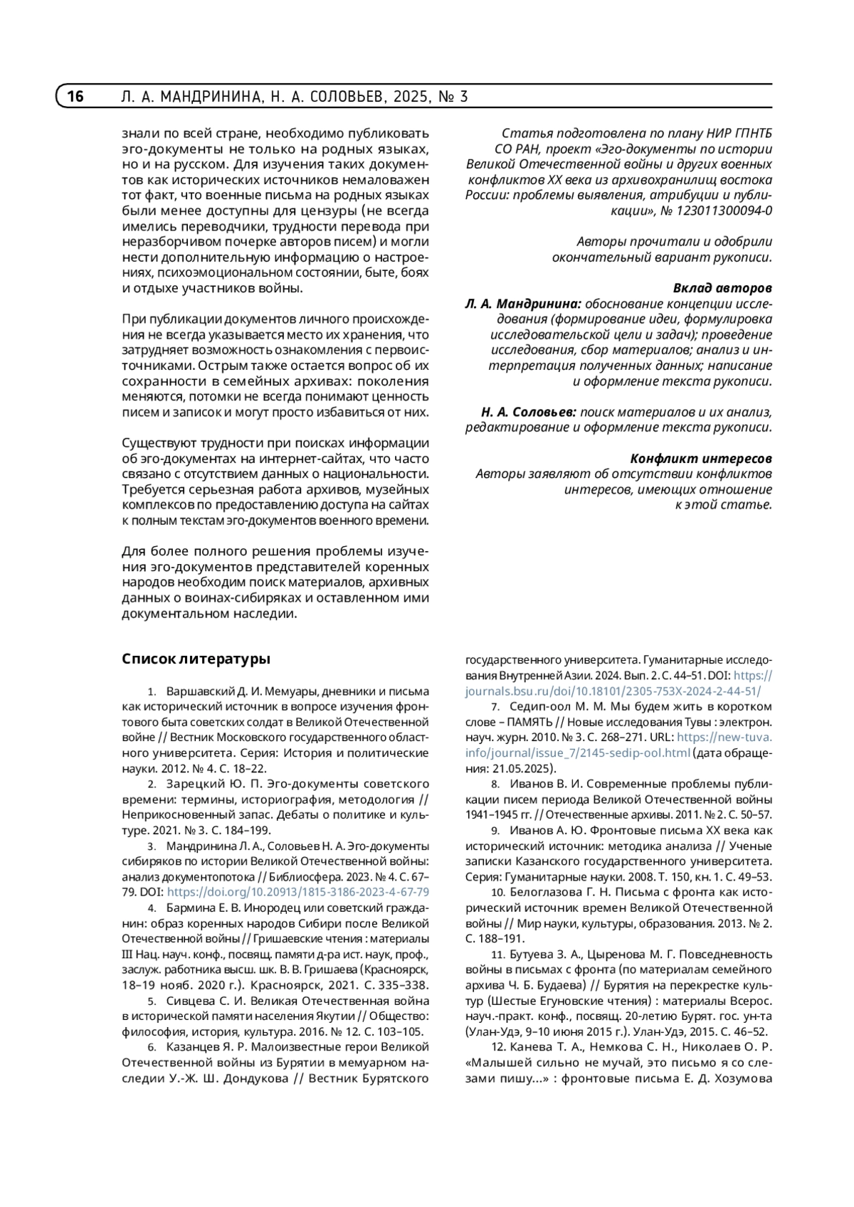 3. Мандринина Л. А., Соловьев Н. А. Эго-документы сибиряков по истории Великой Отечественной войны: анализ документопотока // Библиосфера. 2023. № 4. С. 67-79. https://doi.org/10.20913/1815-3186-2023-4-67-79