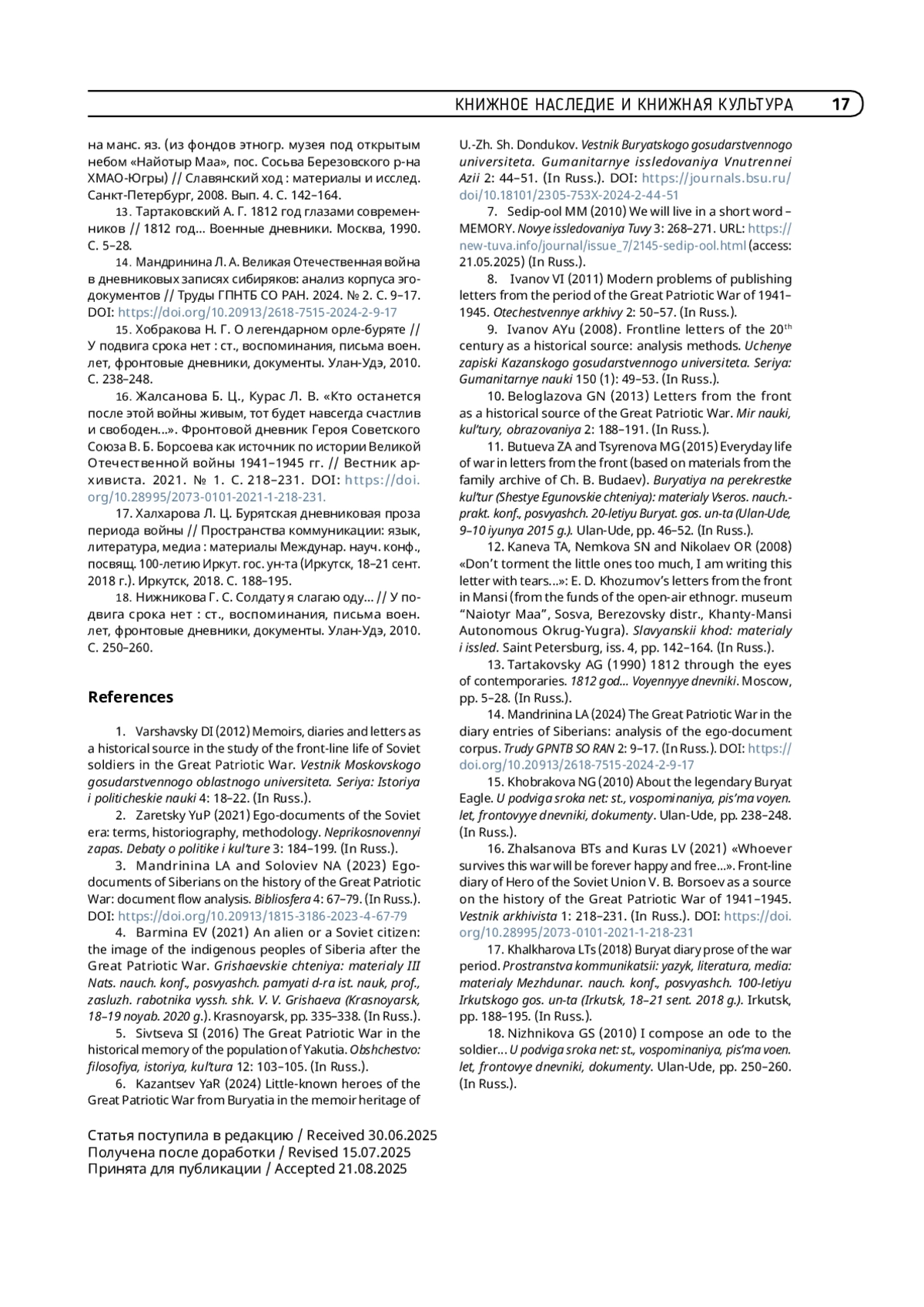 14. Мандринина Л. А. Великая Отечественная война в дневниковых записях сибиряков: анализ корпуса эго-документов // Труды ГПНТБ СО РАН. 2024. № 2. С. 9-17. https://doi.org/10.20913/2618-7515-2024-2-9-17