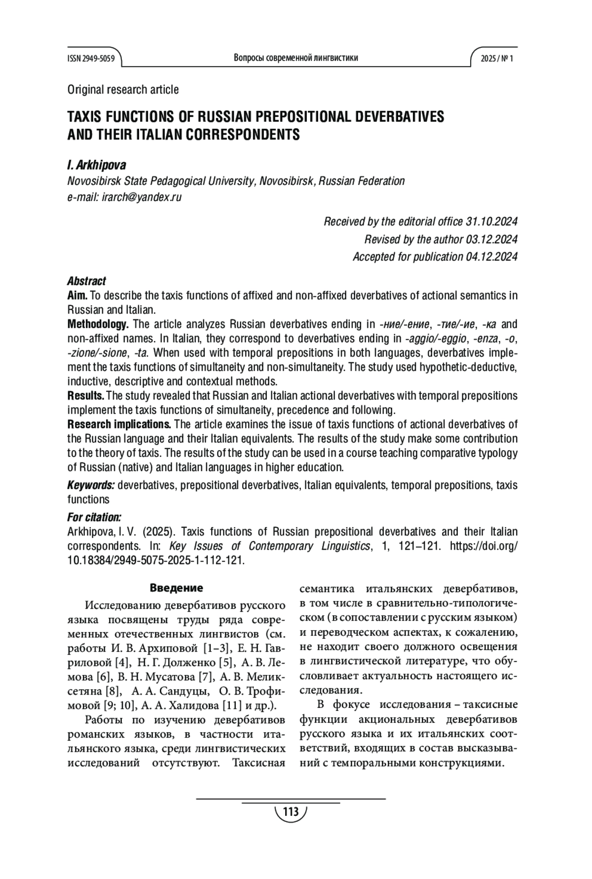 3. Архипова, И. В. Таксисные функции девербативных существительных русского языка (на материале высказываний с предложными конструкциями) / И. В. Архипова // Отечественная филология. - 2023. - № 5. - С. 33-39. DOI: 10.18384/2949-5008-2023-5-33-39 EDN: HEJYGV
