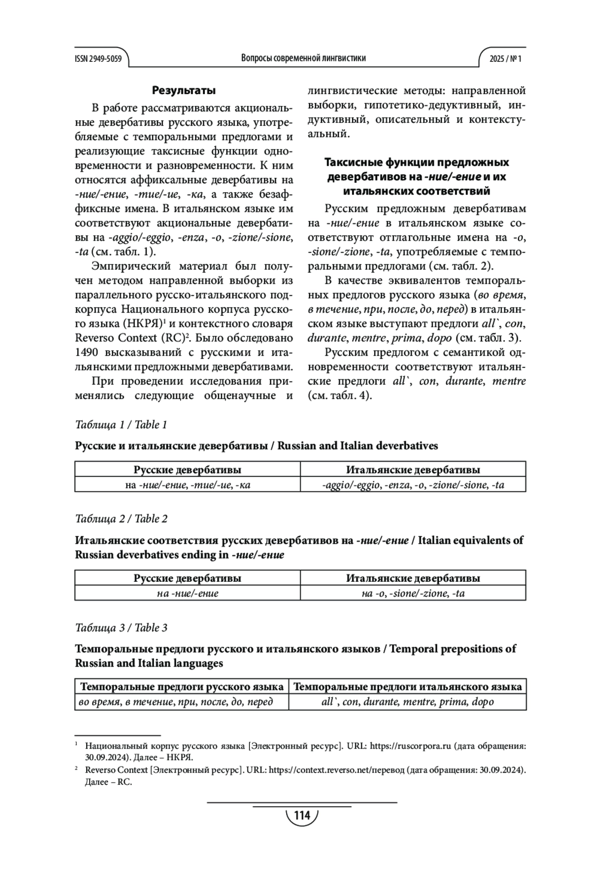 Результаты. Выявлено, что русские и итальянские акциональные девербативы с темпоральными предлогами реализуют таксисные функции одновременности, предшествования и следования.