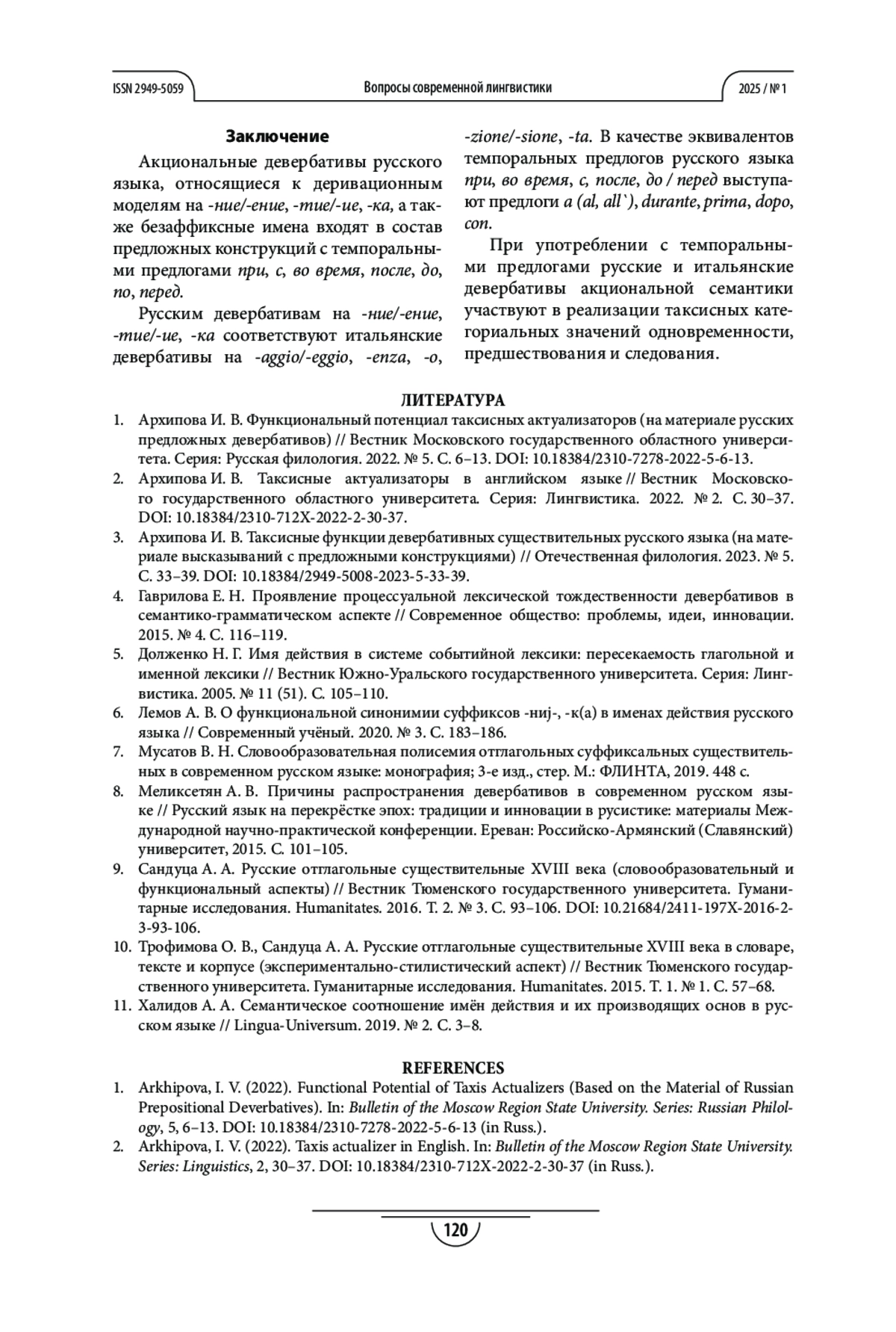 1. Архипова, И. В. Функциональный потенциал таксисных актуализаторов (на материале русских предложных девербативов) / И. В. Архипова // Вестник Московского государственного областного университета. Серия: Русская филология. - 2022. - № 5. - С. 6-13. DOI: 10.18384/2310-7278-2022-5-6-13 EDN: SEUVVC