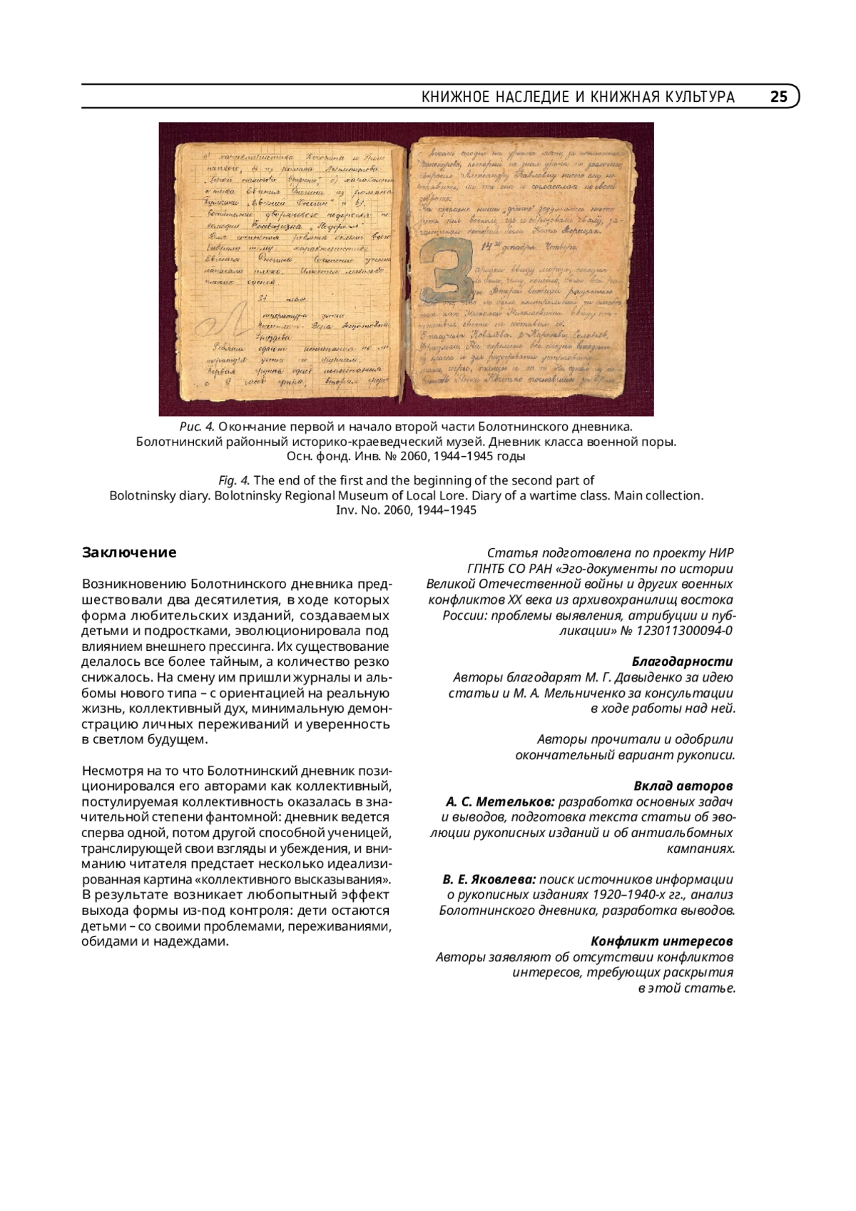 Цель статьи – показать эволюцию рукописных любительских изданий в 1920–1940-е гг. и привести пример эго-документа, возникшего в этих обстоятельствах. Актуальность исследования определяется тем, что оно лежит в области истории повседневности и микроистории. Любительские издания, в особенности созданные детьми, как правило, находятся в тени официальных тиражных изданий и имеют невысокий уровень сохранности, поэтому введение в научный оборот каждого из этих источников безусловно значимо. В статье таким изданием выступает коллективный дневник, который вели школьники г. Болотное Новосибирской области в 1944–1945 гг. Исследование демонстрирует, что, несмотря на прессинг государства в отношении дневников и альбомов, а также на попытки заменить содержание старых форм новым, более соответствующим советской действительности, детский дневник не всегда вписывается в навязанные рамки и показывает жизнь детей в ее реальном виде.