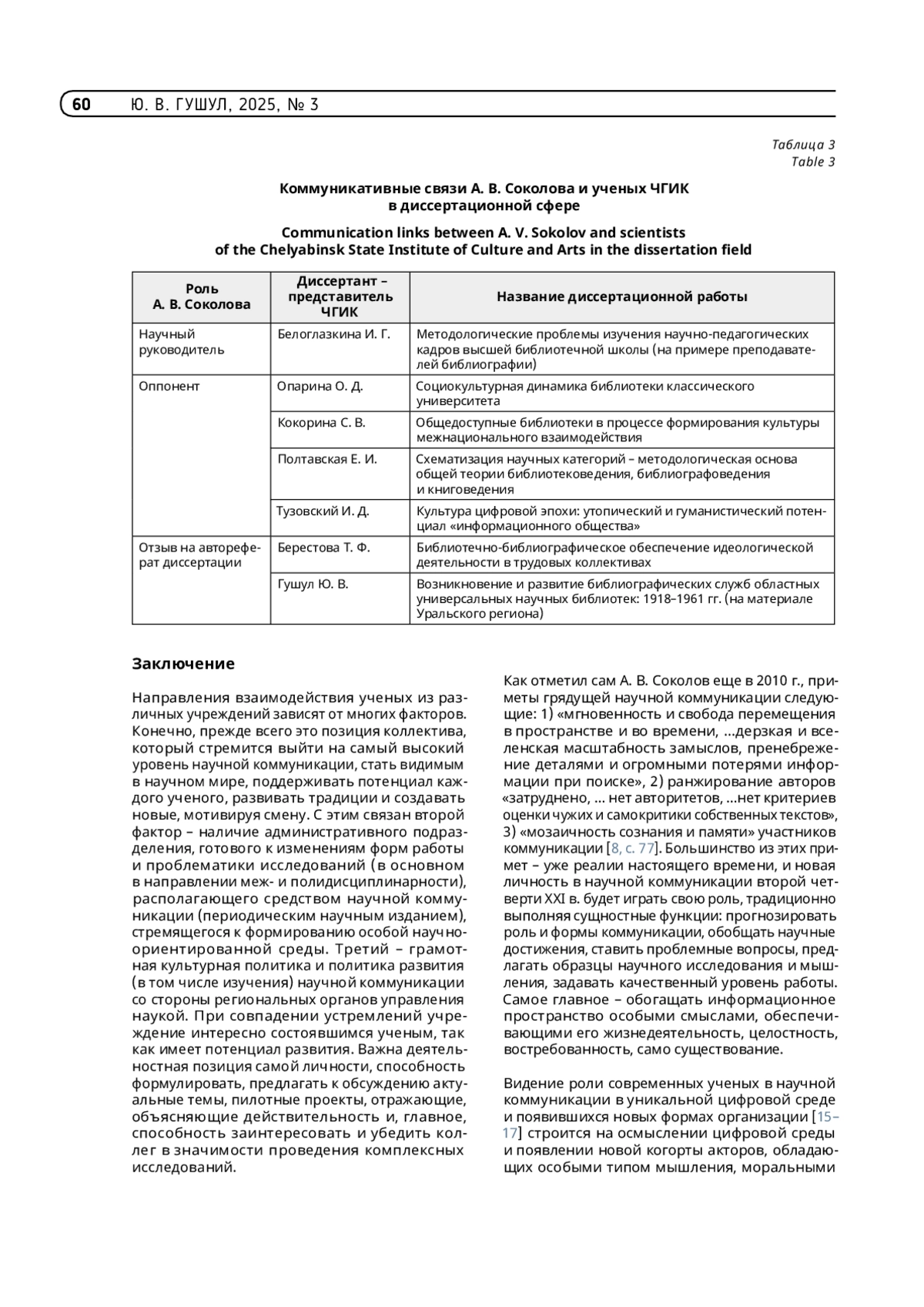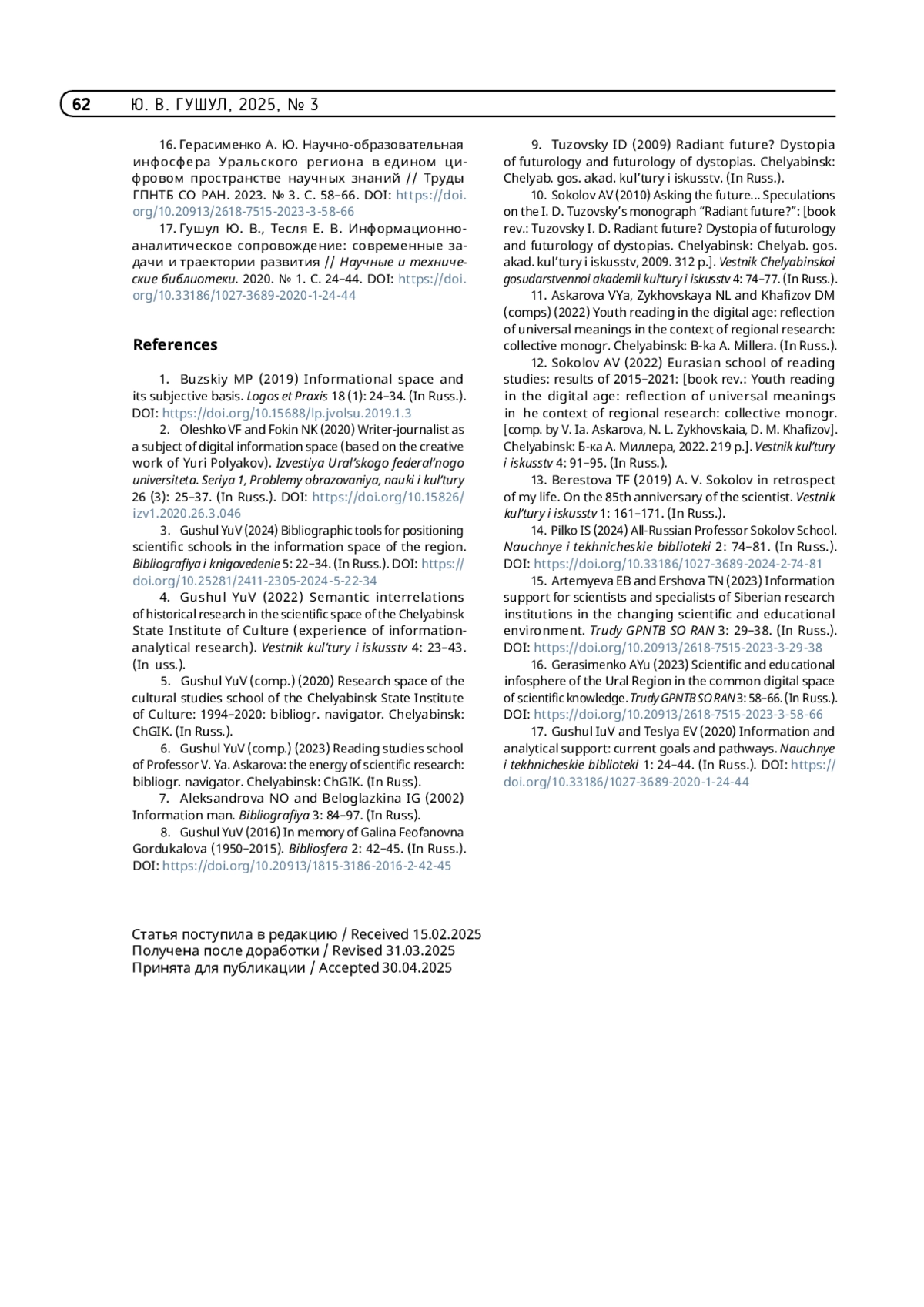 3. Гушул Ю. В. Библиографические инструменты позиционирования научных школ в информационном пространстве региона // Библио-графия и книговедение. 2024. № 5. С. 22-34. https://doi.org/10.25281/2411-2305-2024-5-22-34