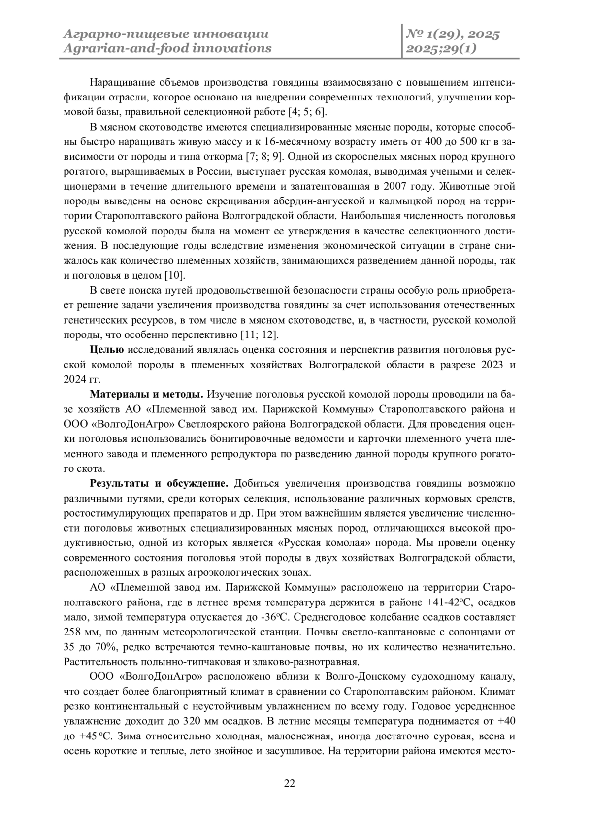 Цель. Оценка состояния и перспектив развития поголовья русской комолой породы в племенных хозяйствах Волгоградской области в разрезе 2023 и 2024 гг.