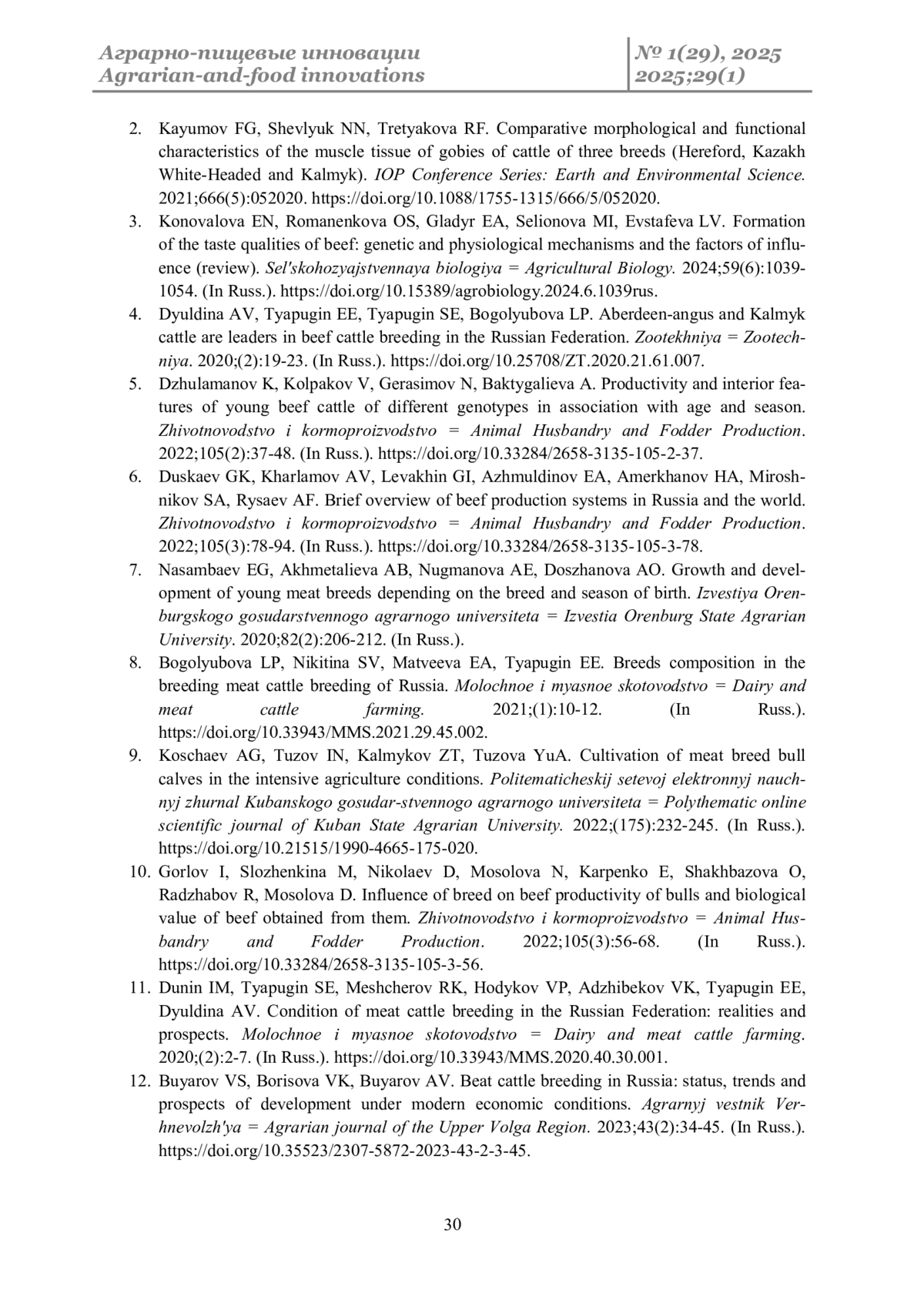 12. Буяров В.С., Борисова В.К., Буяров А.В. Мясное скотоводство России: состояние, тенденции и перспективы развития в современных экономических условиях // Аграрный вестник Верхневолжья. 2023. Т. 43. № 2C:\Users\Yuri Daniloff\Desktop\Сборники\АПИ\Журнал №29 (2025)\№ 2. С. 34-45.