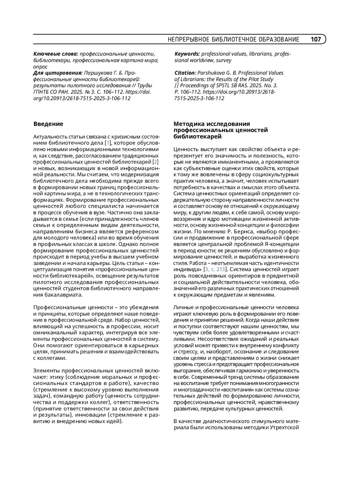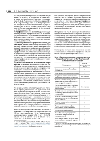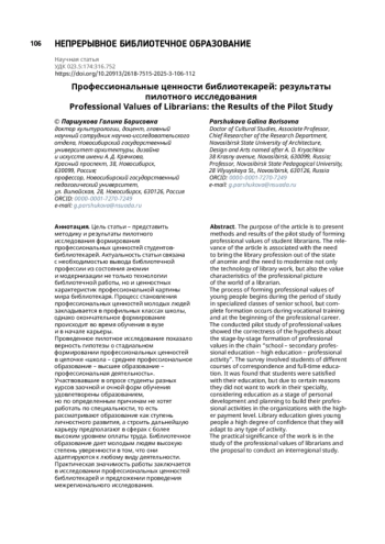 Цель статьи – представить методику и результаты пилотного исследования формирования профессиональных ценностей студентов-библиотекарей. Актуальность статьи связана с необходимостью вывода библиотечной профессии из состояния аномии и модернизации не только технологии библиотечной работы, но и ценностных характеристик профессиональной картины мира библиотекаря. Процесс становления профессиональных ценностей молодых людей закладывается в профильных классах школы, однако окончательное формирование происходит во время обучения в вузе и в начале карьеры. Проведенное пилотное исследование показало верность гипотезы о стадиальном формировании профессиональных ценностей в цепочке «школа – среднее профессиональное образование – высшее образование – профессиональная деятельность». Участвовавшие в опросе студенты разных курсов заочной и очной форм обучения удовлетворены образованием, но по определенным причинам не хотят работать по специальности, то есть рассматривают образование как ступень личностного развития, а строить дальнейшую карьеру предполагают в сферах с более высоким уровнем оплаты труда. Библиотечное образование дает молодым людям высокую степень уверенности в том, что они адаптируются к любому виду деятельности. Практическая значимость работы заключается в исследовании профессиональных ценностей библиотекарей и предложении проведения межрегионального исследования.
