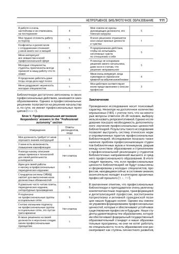 Проведенное исследование носит поисковый характер. Несмотря на достаточное количество опрошенных (183), с учетом того, что на некоторые вопросы ответили 26–28 человек, выборку нельзя назвать репрезентативной. Однако исследование показало необходимость дополнительного изучения профессиональных ценностей библиотекарей.