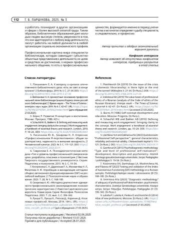 2. Войлокова Н. А. Ценностные основания профессиональной этики библиотекаря (анализ Кодекса этики российского библиотекаря) // Время науки - The Times of Science : электрон. науч. журн. 2019. № 4. С. 62-67. URL: https://tsput.ru/fb/VN/2019№4_2019/62/index.html (дата обращения: 27.03.2025).