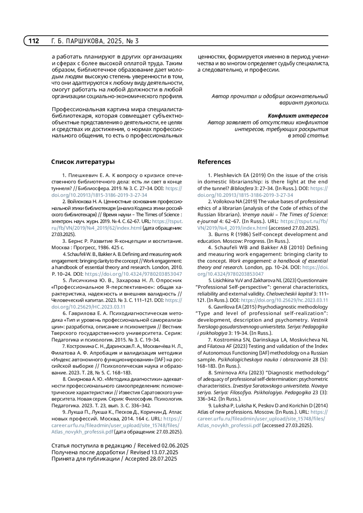 8. Смирнова А. Ю. «Методика диагностики» адекватности профессионального самоопределения: психометрические характеристики // Известия Саратовского университета. Новая серия. Серия: Философия. Психология. Педагогика. 2023. Т. 23, вып. 3. С. 336-342.