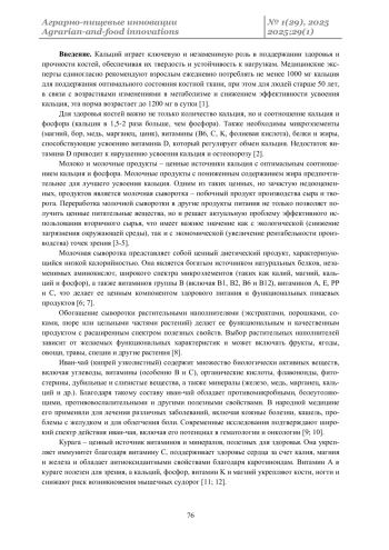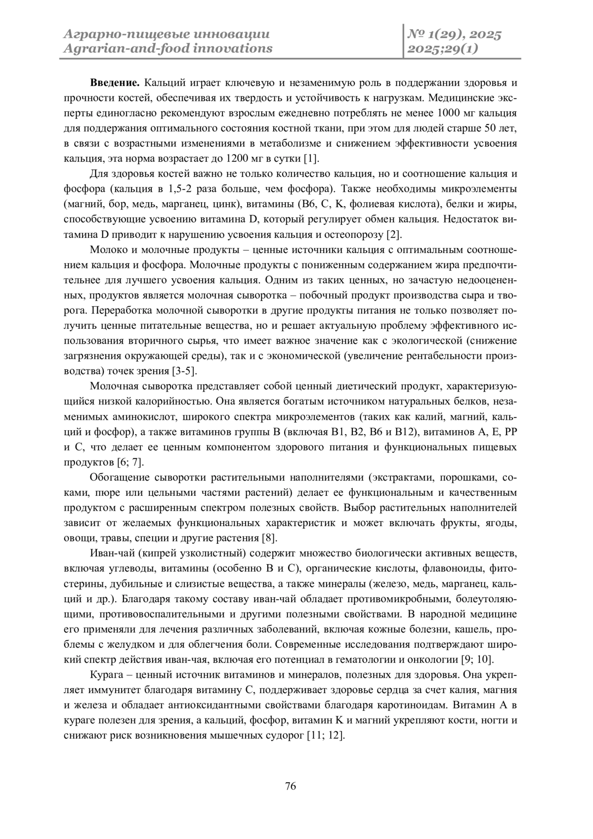 Материалы и методы. В представленной работе использовалось вторичное молочное сырье - сыворотка, полученная в процессе переработки молока. Для оценки качества сыворотки и сывороточного напитка применялись стандартизированные методы: исходную сыворотку и сывороточный напиток оценивали по органолептическим показателям (вкус, запах, цвет, консистенция) согласно ГОСТ 34352-2017 и ГОСТ 33957-2016, кислотность определяли индикаторным методом по ГОСТ 3624-92, массовую долю сухого вещества - по ГОСТ Р 54668-2011, массовую долю сывороточного белка - по ГОСТ Р 54756-2011, массовую концентрацию сахаров по - ГОСТ Р 54667-2011, массовую долю кальция - по ГОСТ Р 55331-2012, массовую долю фосфора - по ГОСТ 31980-2012, а массовые доли калия и магния - по ГОСТ ISO 8070/IDF 119-2014. Использование стандартизированных методик анализа обеспечивает точность, надежность и сопоставимость полученных результатов, что позволяет объективно оценить качество сыворотки и сывороточного напитка, а также эффективность обогащения сыворотки растительными наполнителями.