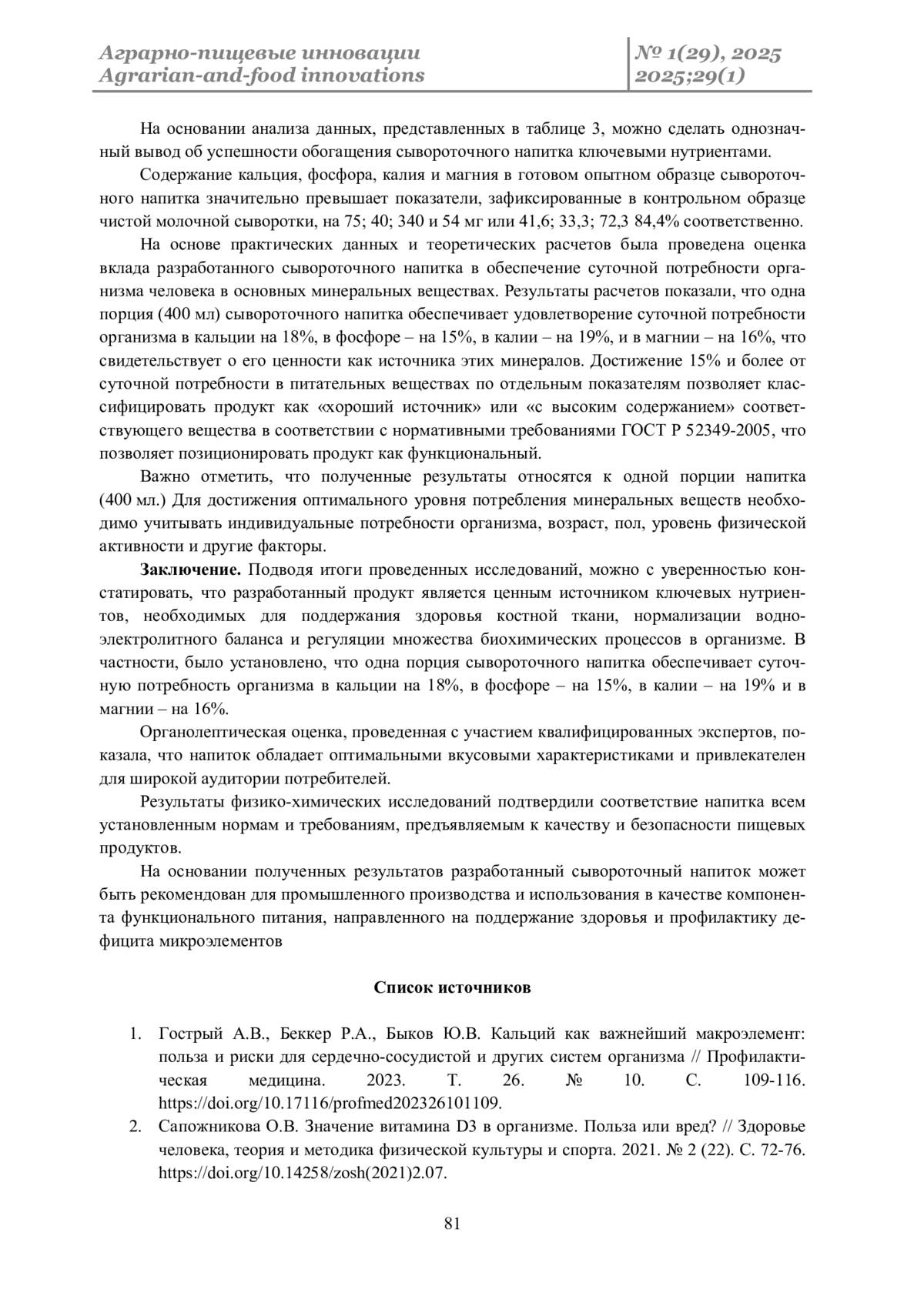 Заключение. По результатам проведенных исследований была разработана инновационная технология производства функционального напитка из вторичного молочного сырья специализированного назначения. Данная технология представляет собой практическое решение для эффективного использования ценного побочного продукта молочной промышленности и создания востребованной продукции с улучшенными потребительскими свойствами и потенциальной пользой для здоровья.