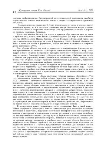 Э. Эмир – современный крымскотатарский композитор, в творчестве которого аккумулируются специфические приметы художественного мышления, как предшествующих эпох, так и XX века. Общеизвестно, что взаимодействие традиционного и инновационного в музыкальном искусстве второй половины XX века приводит к «множественности техник современного композиторского творчества» [8. С. 9]. При этом гармония, как компонент стилевой системы, также обновляется, включая в себя аккорды нетерцового строения и теряя тонально-функциональные связи